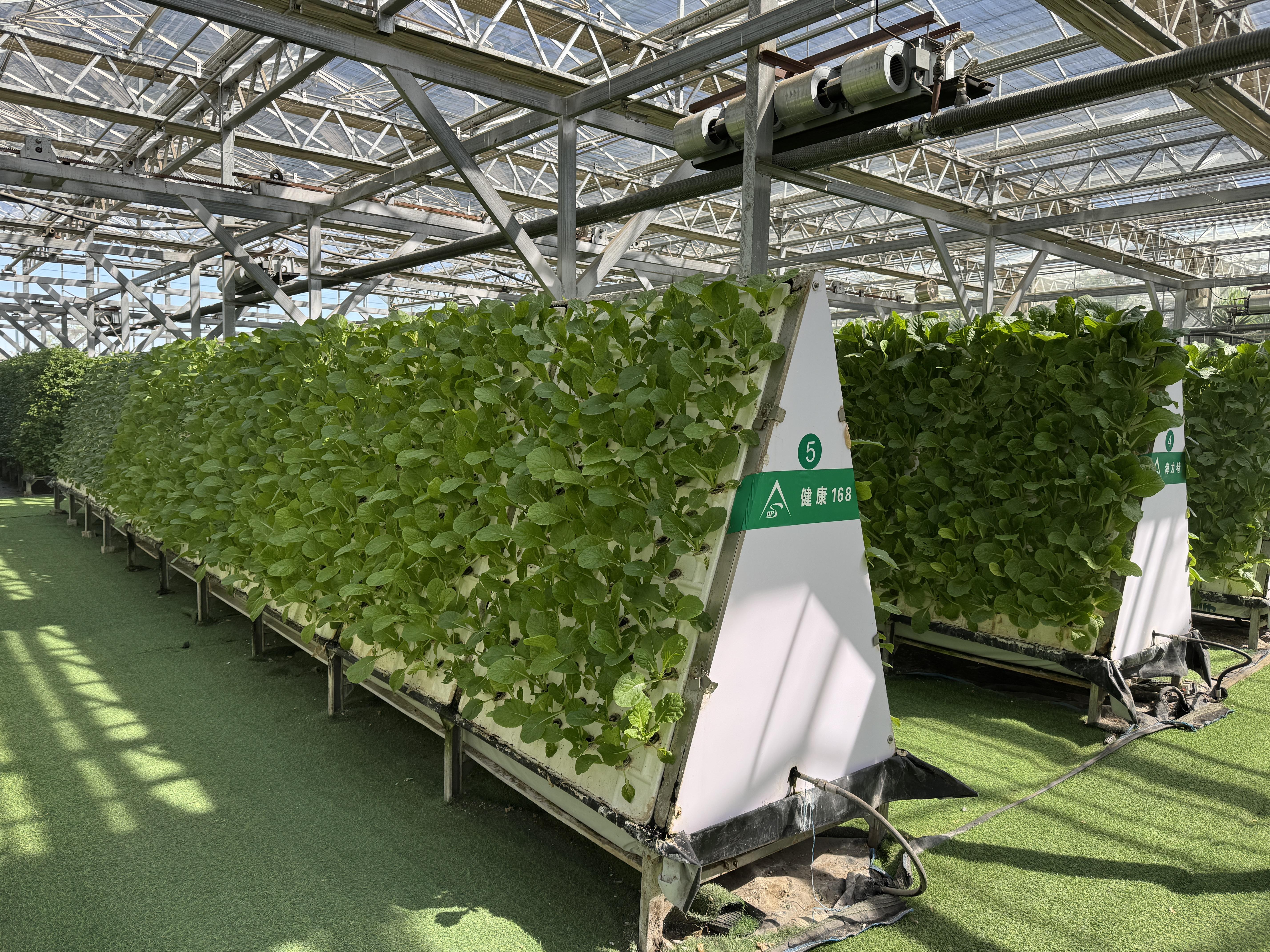 记者在温室的有机蔬菜生产车间看到,整齐排列的蔬菜种植架上,绿油油的青菜、香菜正在拔节生长。通过智能调节的云雾培技术,营养液和灌溉用水被雾化成微米级雾滴,以间歇弥雾方式直接喷射到植物根系,为植物生长提供必需的水分和营养。“既节水又高效,叶菜类蔬菜的采收周期缩短至30天。”一〇四团畜牧连副政委、工会主席张晶晶说。