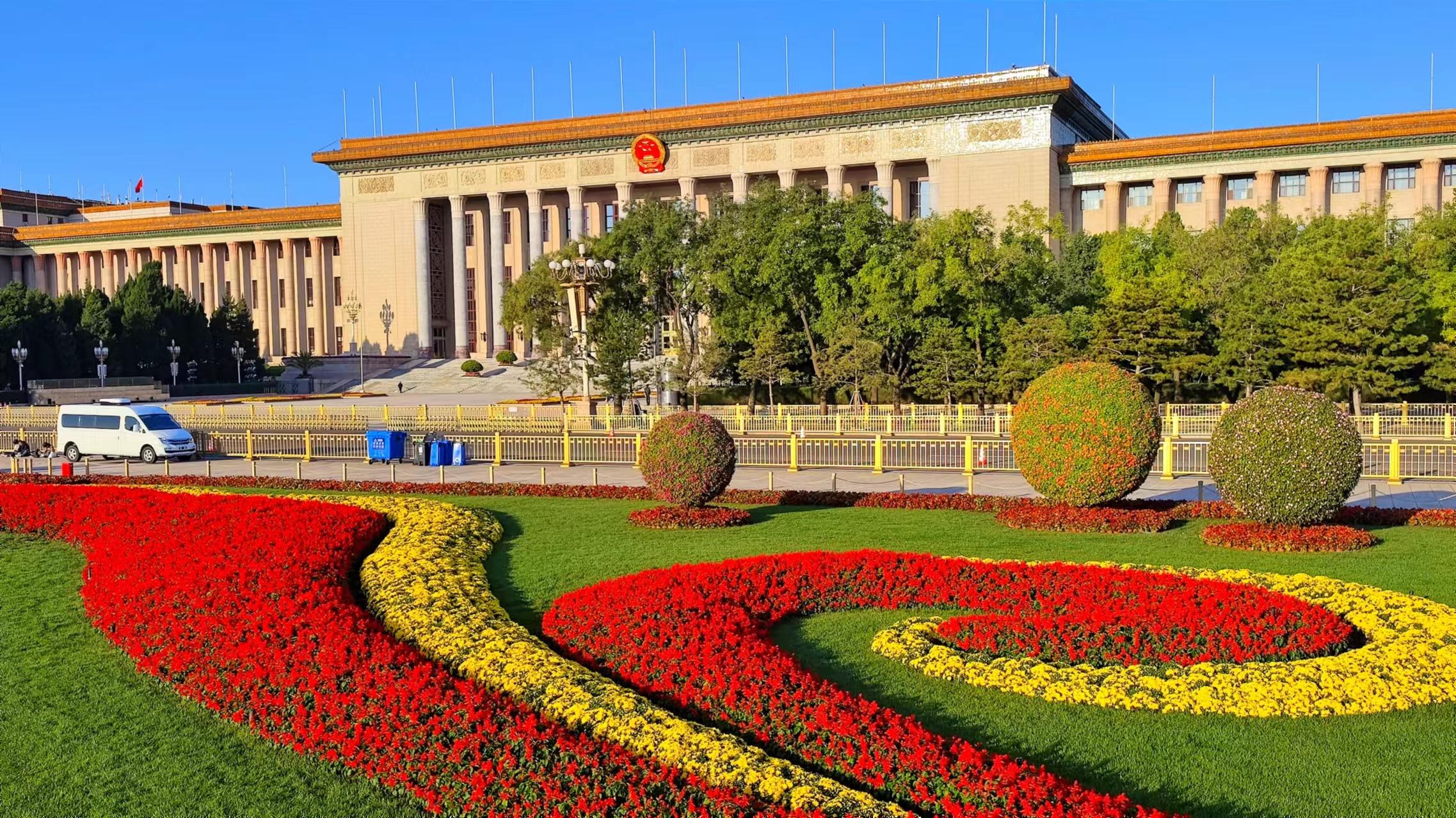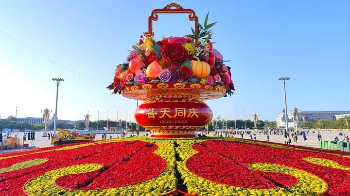 9月23日,天安门广场“祝福祖国”巨型花篮已吊装完成,广场装扮一新,东西两侧花坛里海棠花、菊花、串红等花卉竞相开放,花团锦簇盛装迎接国庆75周年。