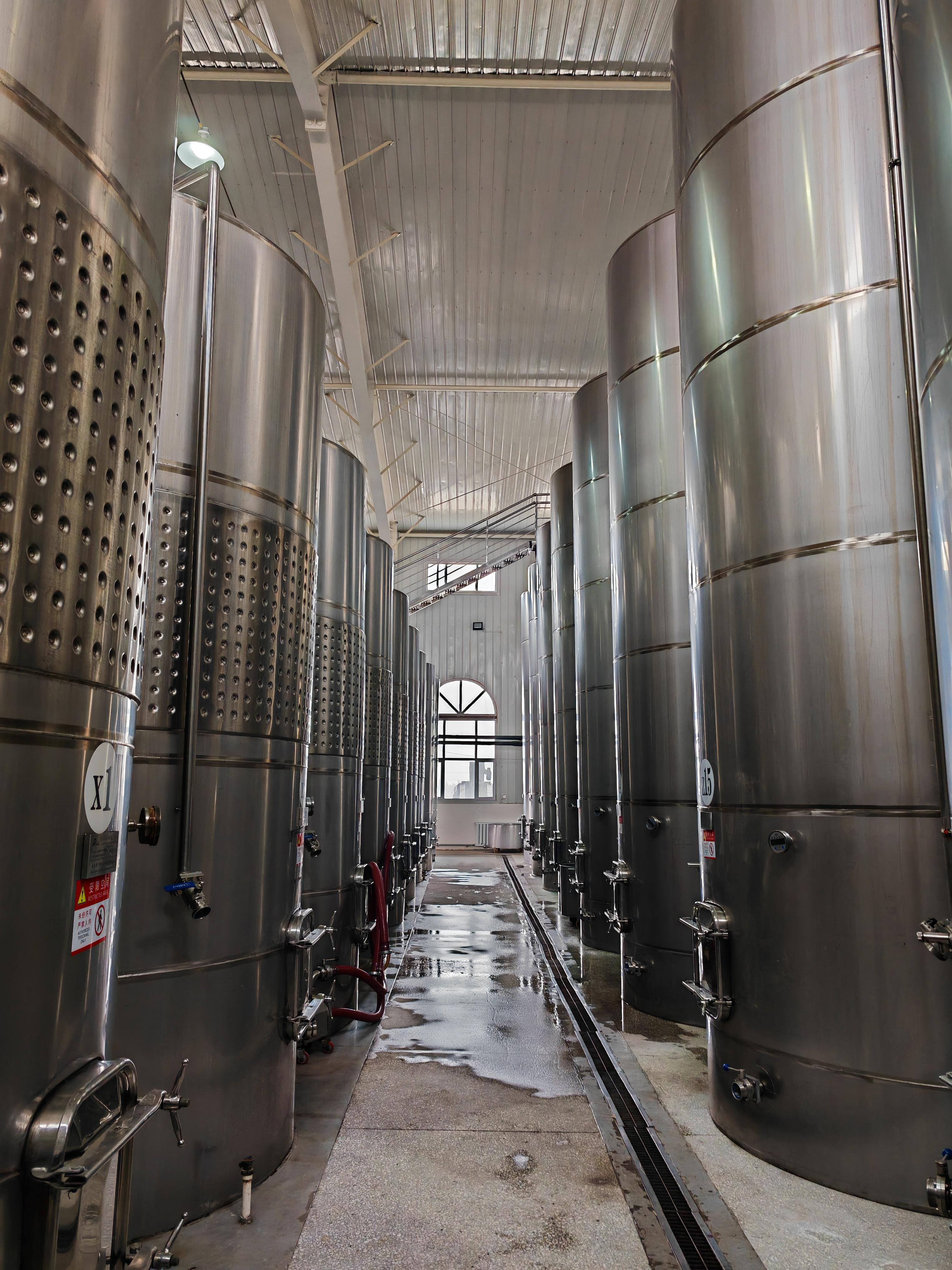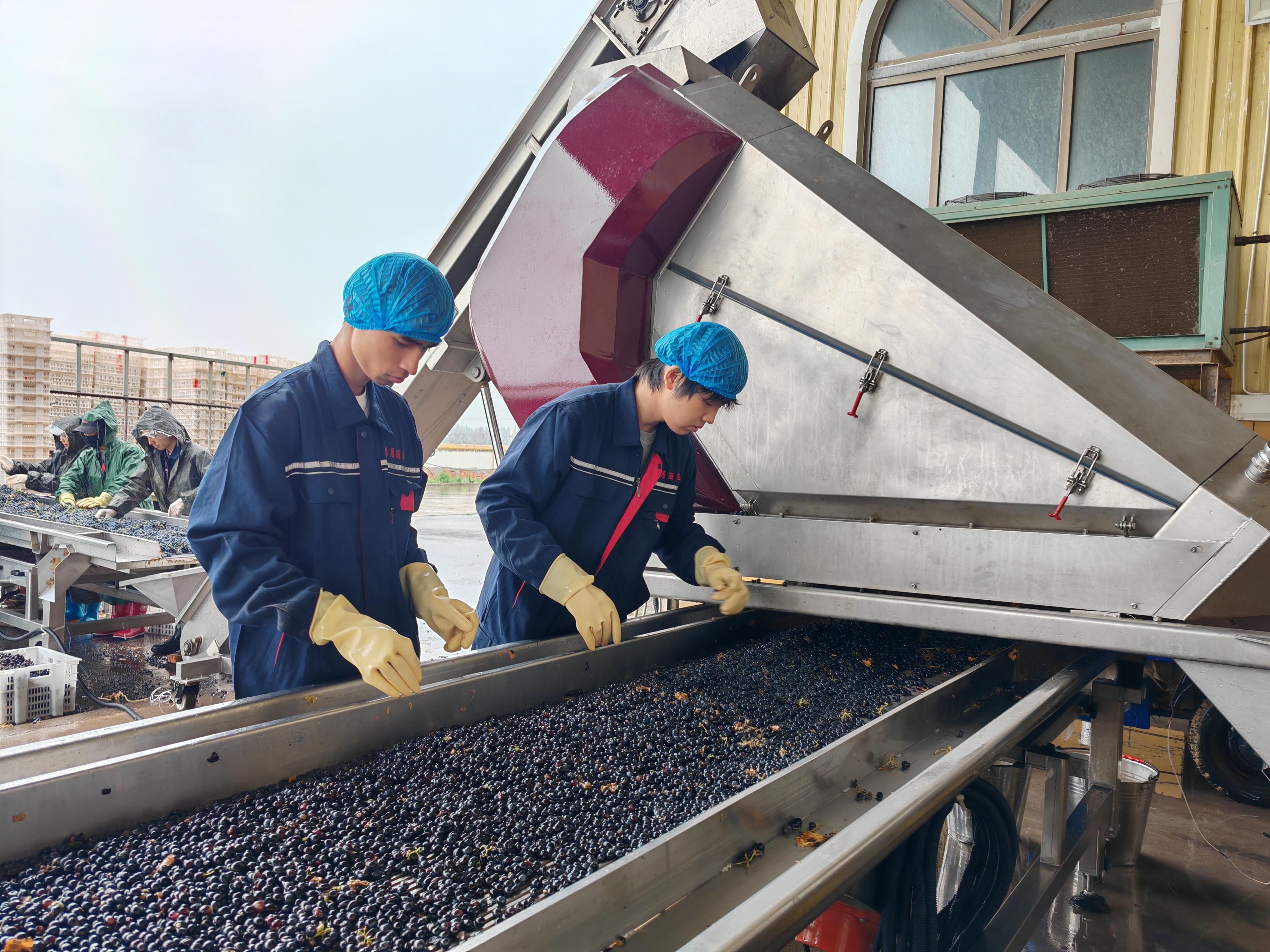 在弓月酒庄的生产园区,刚从葡萄园采摘的新鲜马瑟兰,经过工人们认真筛选除杂,再通过自动化输送设备,源源不断地进入容器发酵。