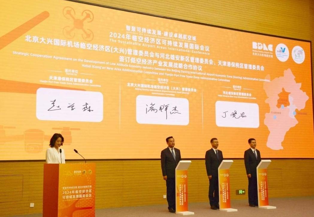 记者近日从2024年临空经济区可持续发展国际会议上获悉,河北雄安新区管理委员会、天津港保税区管理委员会与临空区大兴片区管委会共同签署《低空经济产业发展战略合作协议》,将打造京津冀低空经济生态圈。