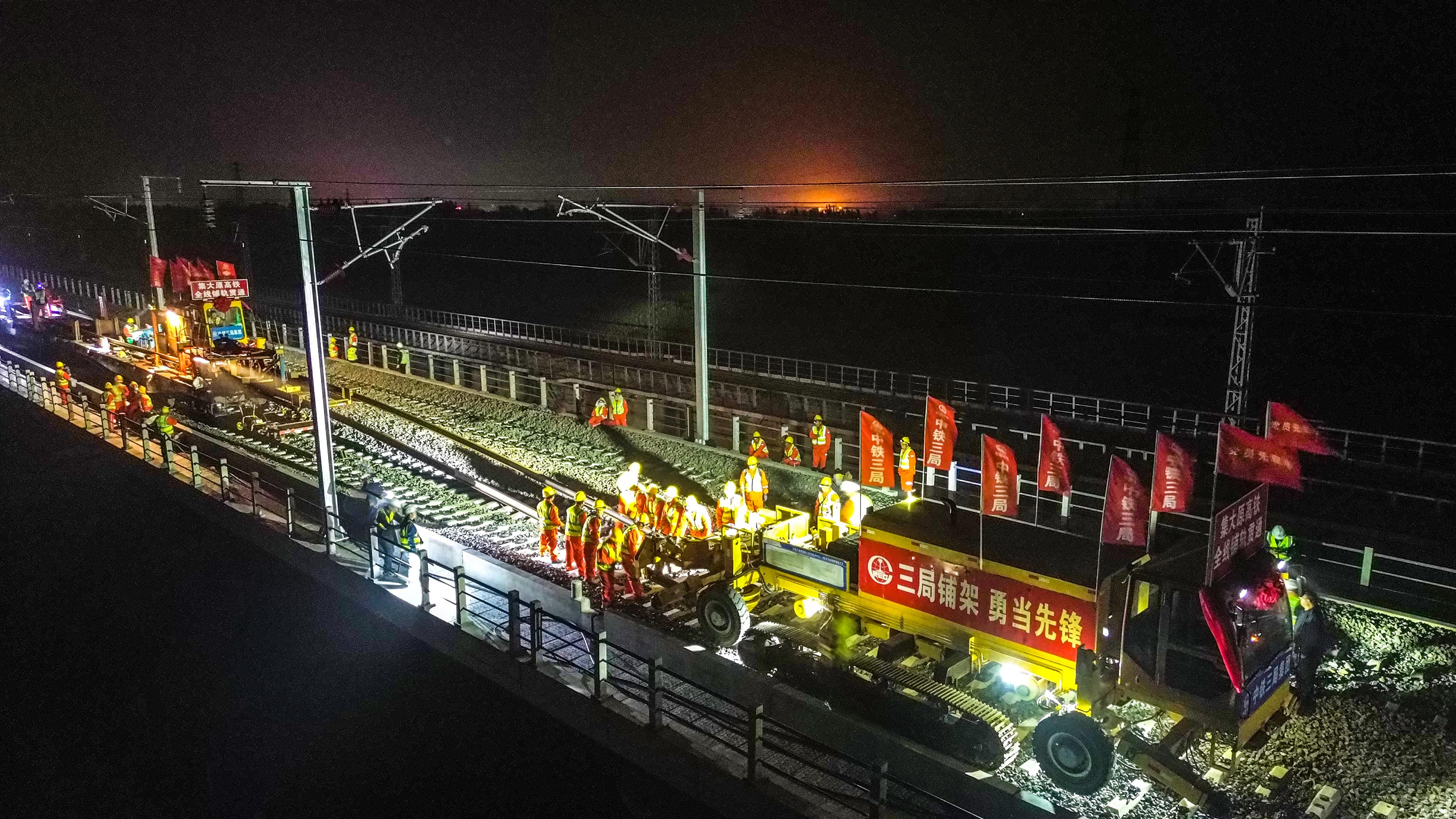 记者从施工单位中铁三局了解到,他们克服了邻近既有营业铁路施工多、精度要求高、工期紧、安全风险大等困难,累计投入铺轨设备、长轨运输车、捣固机等大型机械设备30余台(套),高峰期有2000余人同时作业,并积极应用创新技术,单日铺轨最高达到了16公里。