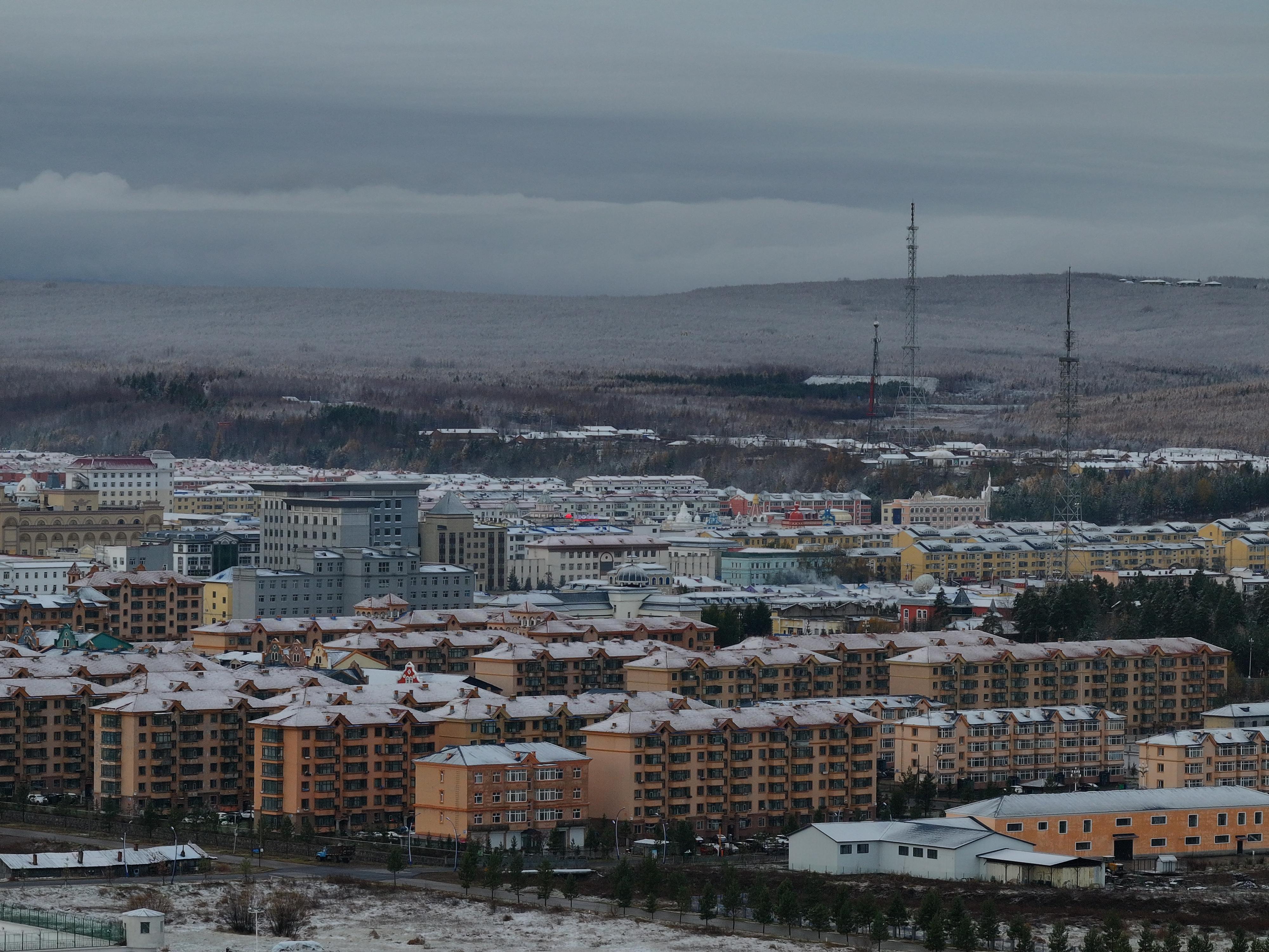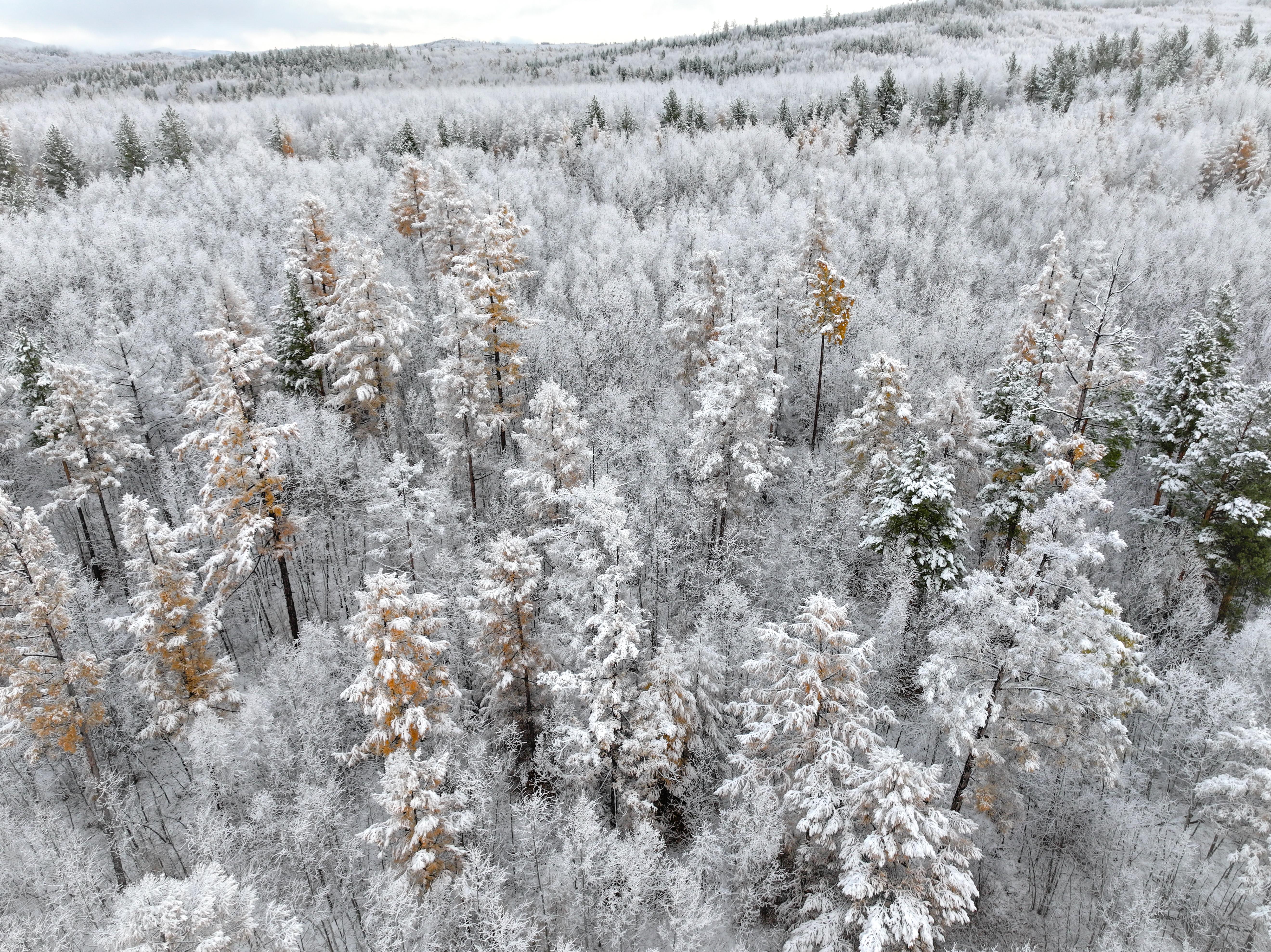9月28日晚间至29日凌晨,黑龙江省漠河市迎来秋后的第一场降雪,秋冬美景相映成趣。
