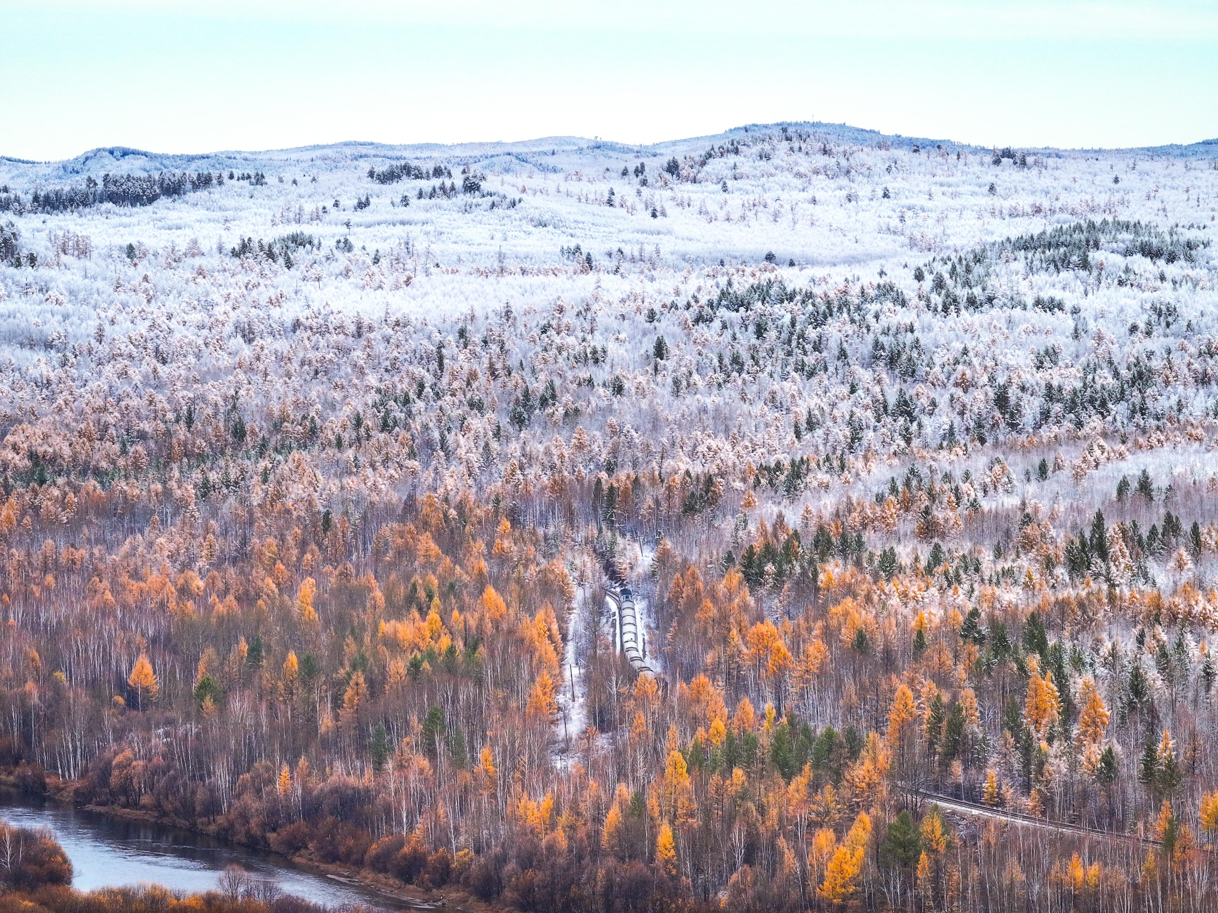 眼下正值漠河的金秋时节,突如其来的降雪为北国秋色增添了别样美景,松枝上布满了厚厚的雪球,山林之间的秋色景观与皑皑白雪同框,火车在白雪森林穿行而过,宛如童话世界一般,令南方游客惊叹不已。