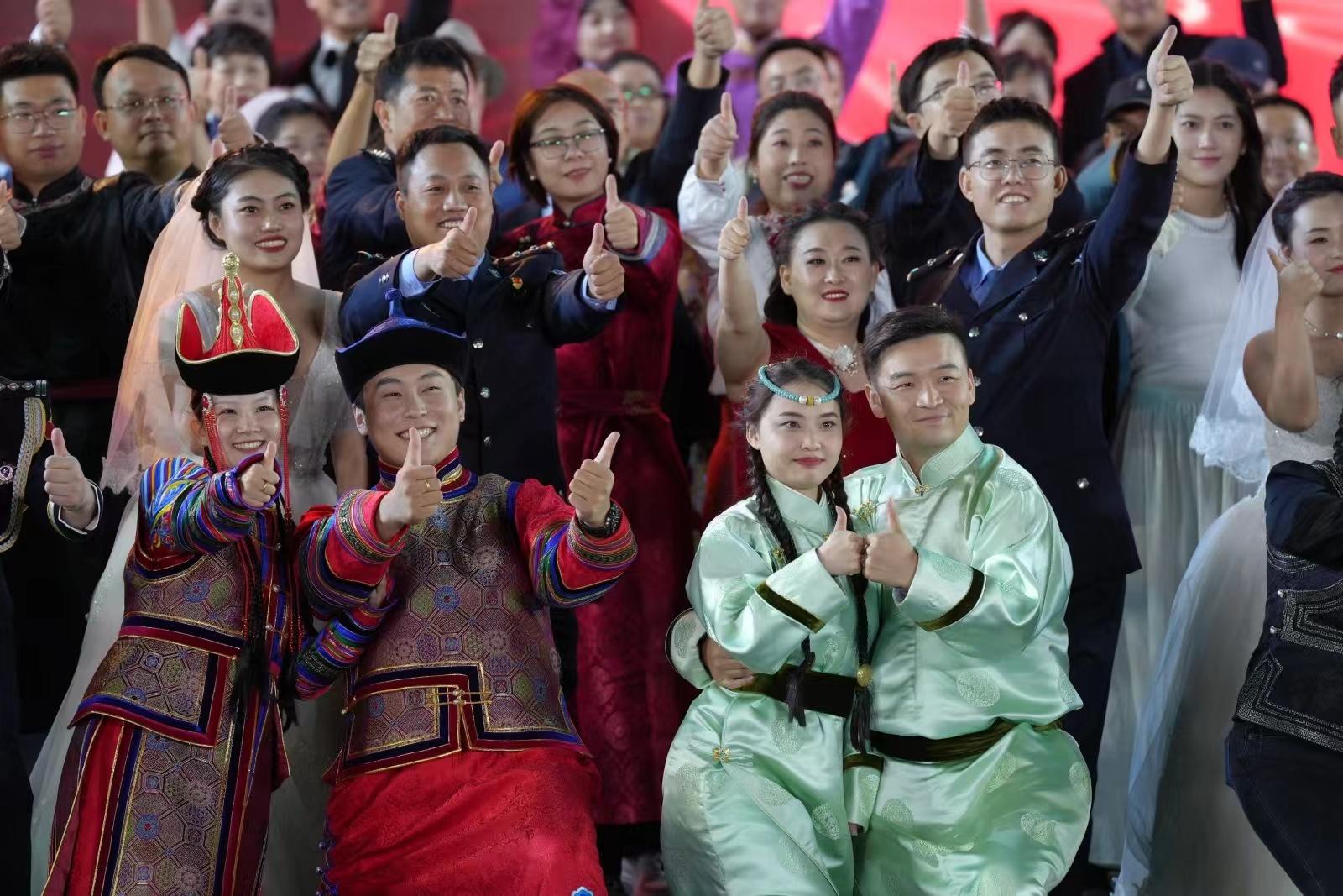 作为开幕式的重要组成部分,第二届“千年胡杨 百年姻缘”主题创意活动再次如约而至。集体婚礼仪式上,99对新人分别搭乘热气球、骑乘骆驼、驾驶沙地摩托、乘坐越野车,缓缓步入盛大的婚礼现场。