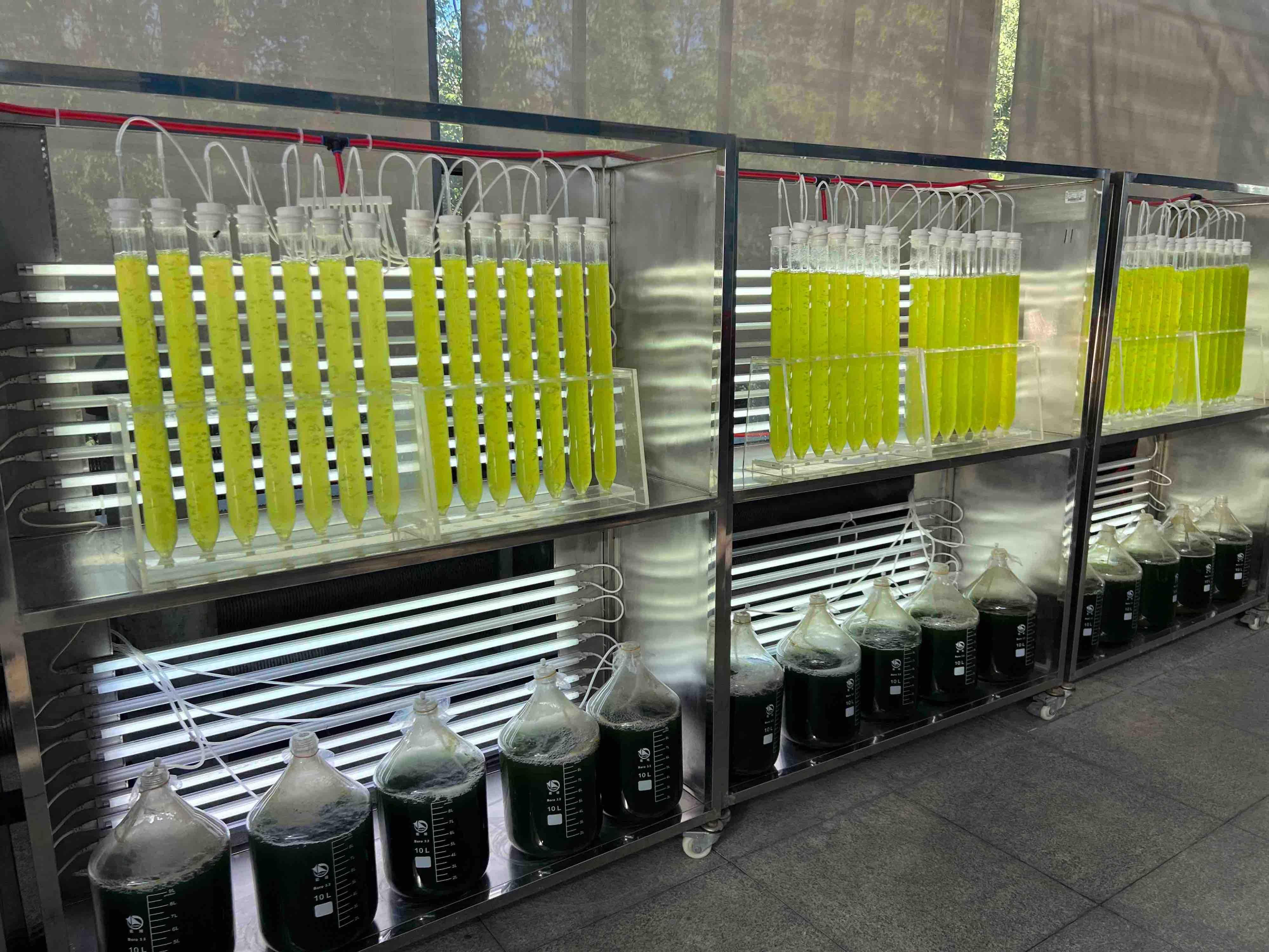 尹文越说,除了植物固碳,还有微藻固碳。在实验室的微藻固碳区,科研人员成功进行了螺旋藻、栅藻等微藻的养殖试验。2023年,新疆庆华与新疆师范大学沙漠藻研究院合作,做沙漠藻的养殖实验工作。沙漠藻可以用于盐碱地改良和提质增效,目前新疆庆华正在做大面积的盐碱地改良和肥效实验。