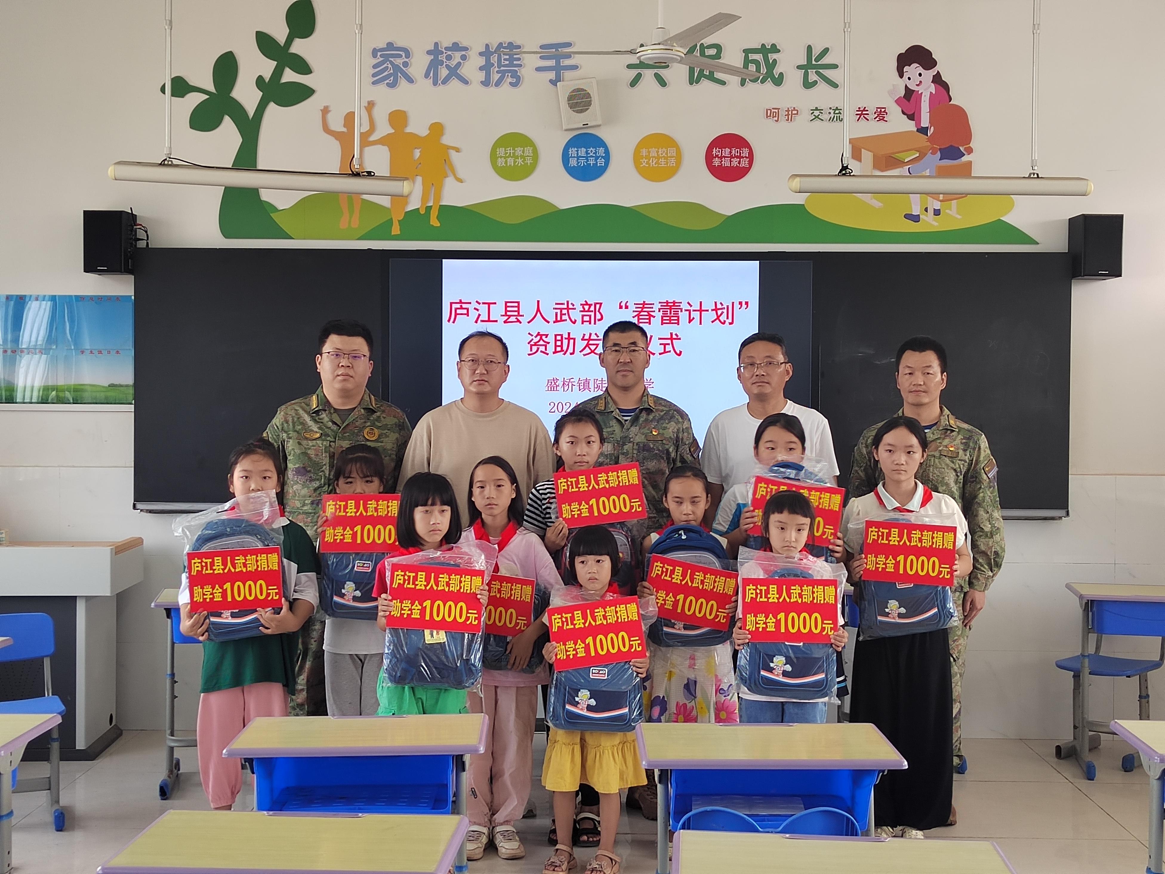 近日,安徽省庐江县人武部走进该县盛桥镇陡岗小学,举行“春蕾计划”资助发放仪式,看望慰问由该部资助的10名“春蕾女童”。这是他们结对帮扶该小学“春蕾女童”的第27个年头。