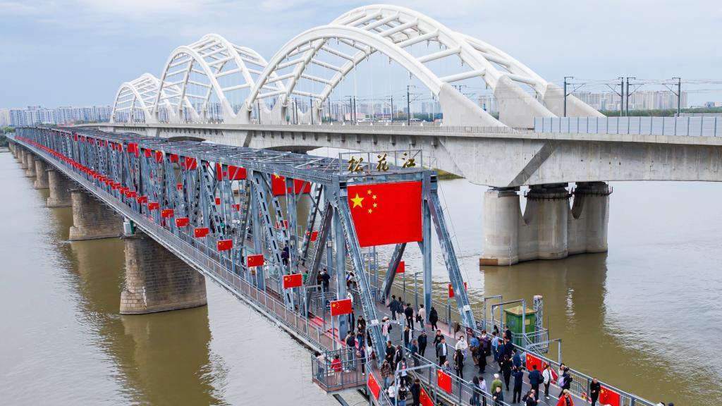 国庆节前夕,横跨松花江、已建百余年的哈尔滨滨洲铁路桥变身“国旗桥”,在数百面国旗的映衬下焕然一新。不少市民和游客来此争相“打卡”,表达对伟大祖国的生日祝福。