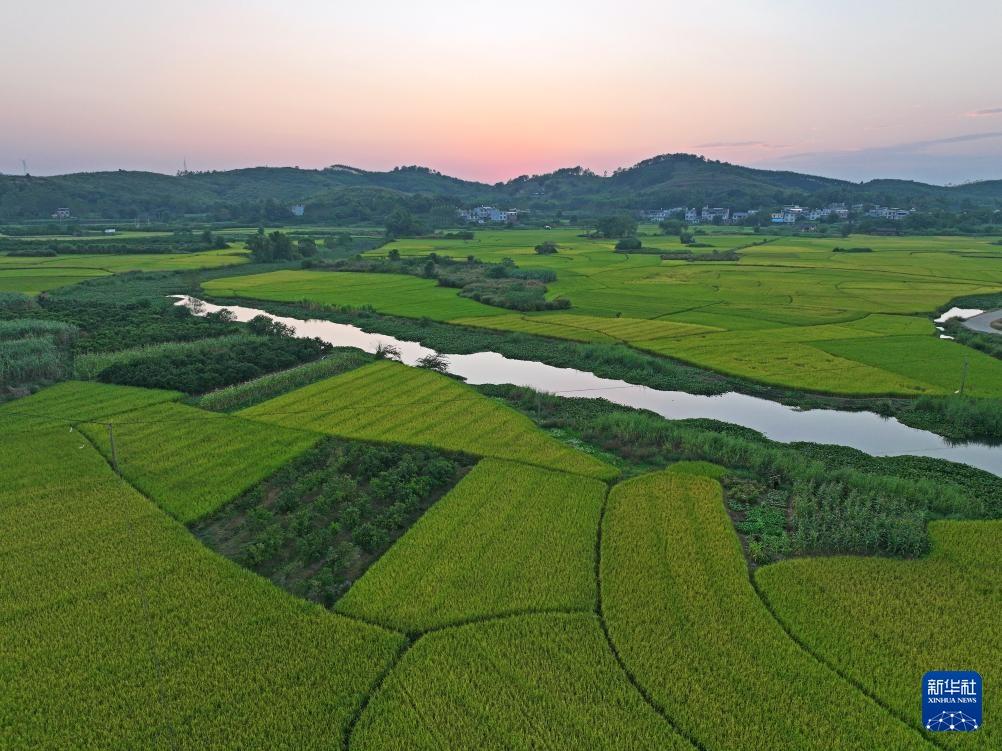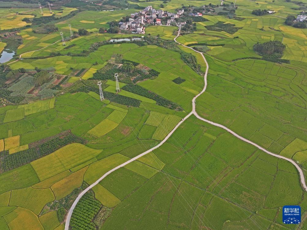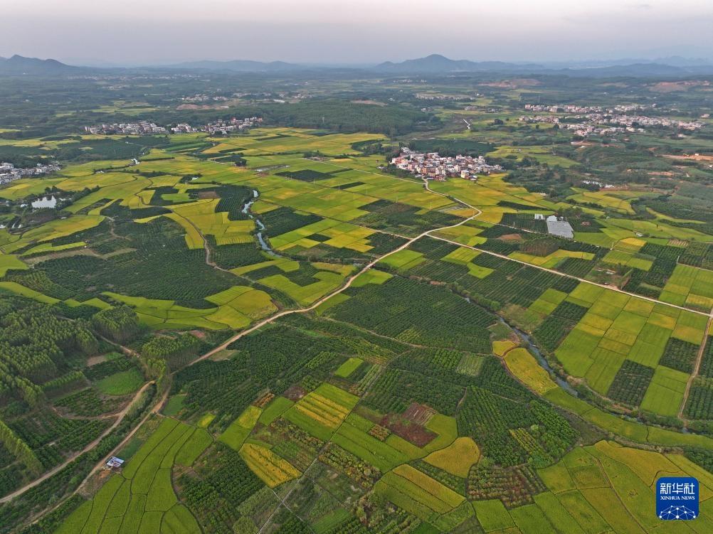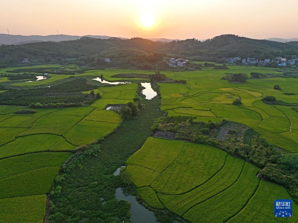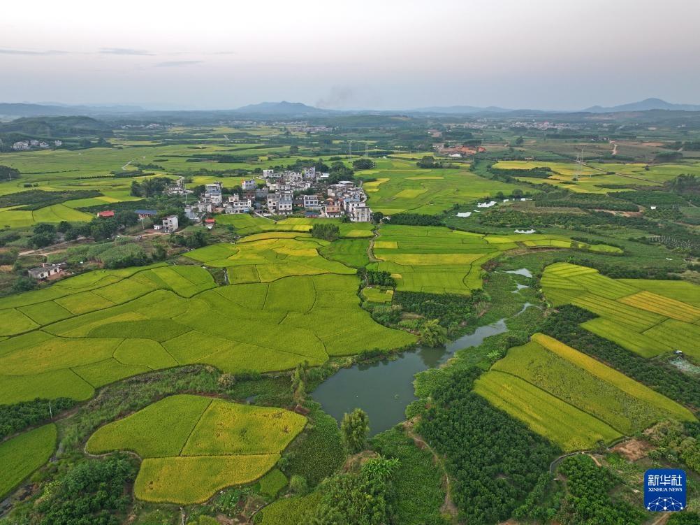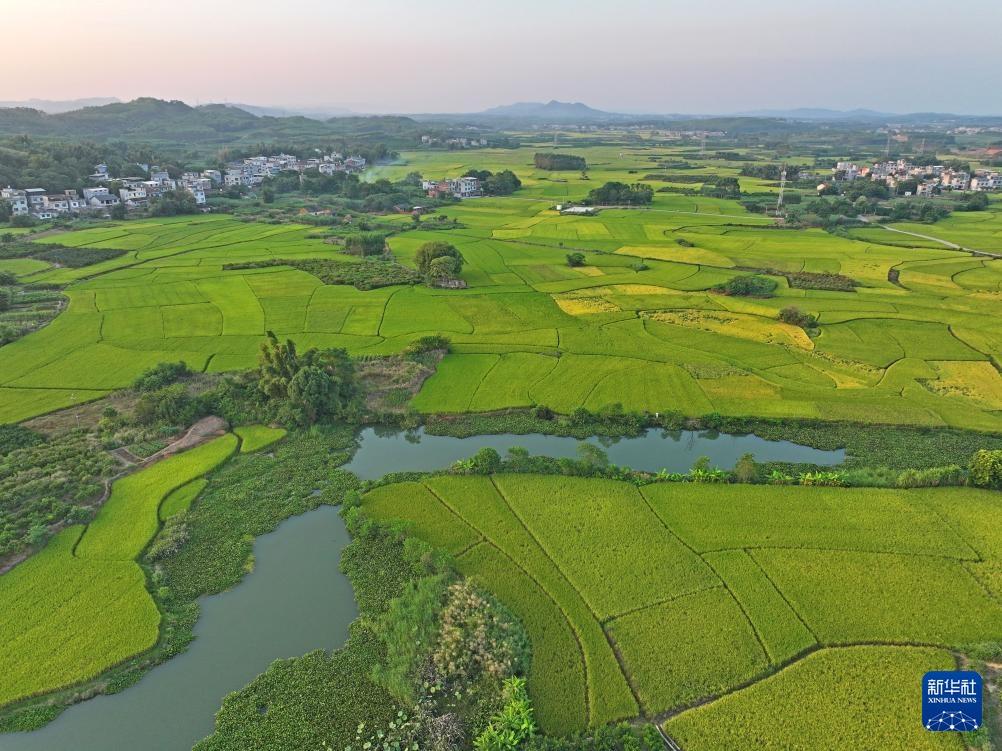 时下正是广西来宾市象州县寺村镇横桥村水稻全产业链示范基地的晚稻灌浆期,丰收在望的田园色彩斑斓,美不胜收。