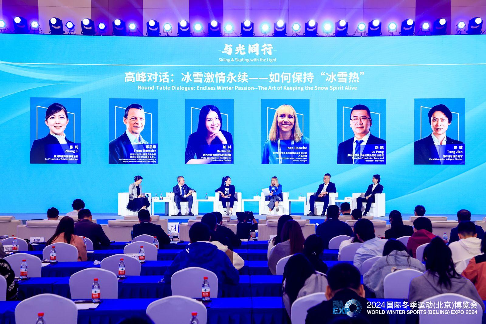 在圆桌对话环节,亚洲数据集团联席总裁张莉作为主持人,与奥地利驻华大使馆商务参赞、奥地利驻北京办事处负责人乐思华,新西兰旅游局市场拓展经理柏林,温特斯泰格体育运动有限公司产品经理Ines Daneke,融创中国执行总裁兼热雪奇迹总裁路鹏,花样滑冰世界冠军佟健,围绕“冰雪激情永续——如何保持‘冰雪热’”主题展开深度交流,从不同领域分享当下冰雪相关领域的发展状况,并对冰雪事业可持续健康发展提出建议。