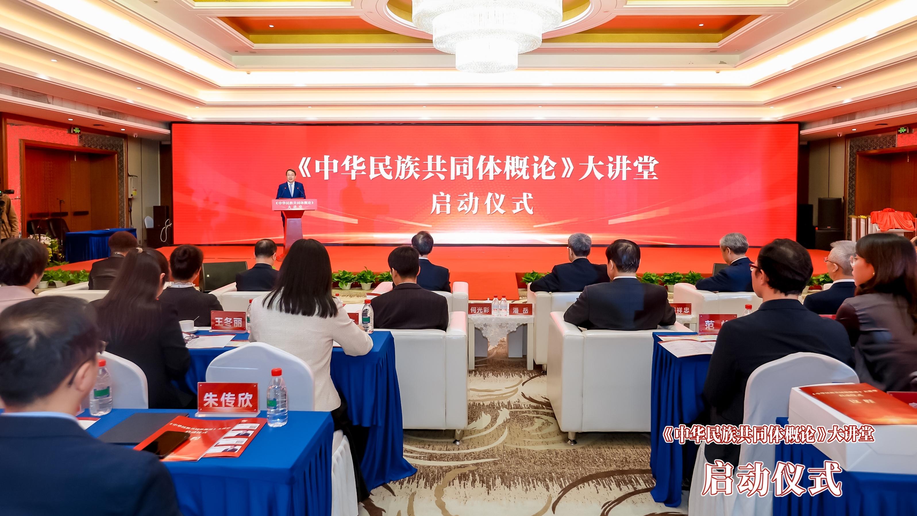 中央统战部副部长,国家民委主任、党组书记潘岳在致辞中强调,国家民委组织编写的《概论》教材,填补了铸牢中华民族共同体意识教育国家统编教材的空白。教材坚持“两个结合”,以中华民族“三交史”为主脉,揭示中华民族共同体从自在到自觉、从传统到现代、从多元凝聚成一体的理论和实践逻辑,构建中华民族共同体史料、话语和理论体系,创新推动马克思主义民族理论中国化最新成果进课堂、进校园。中国传媒大学把《概论》教材以可视化方式创新传播,把历史叙事变成影音图像,推动《概论》从课堂走上荧幕、从校园辐射社会,增强了针对性和吸引力。运用好、传播好大讲堂课程视频,是推动有形有感有效开展铸牢教育、创新高校思政教育、引导各族青年学子深植共同体理念的全新模式,值得大力推广。