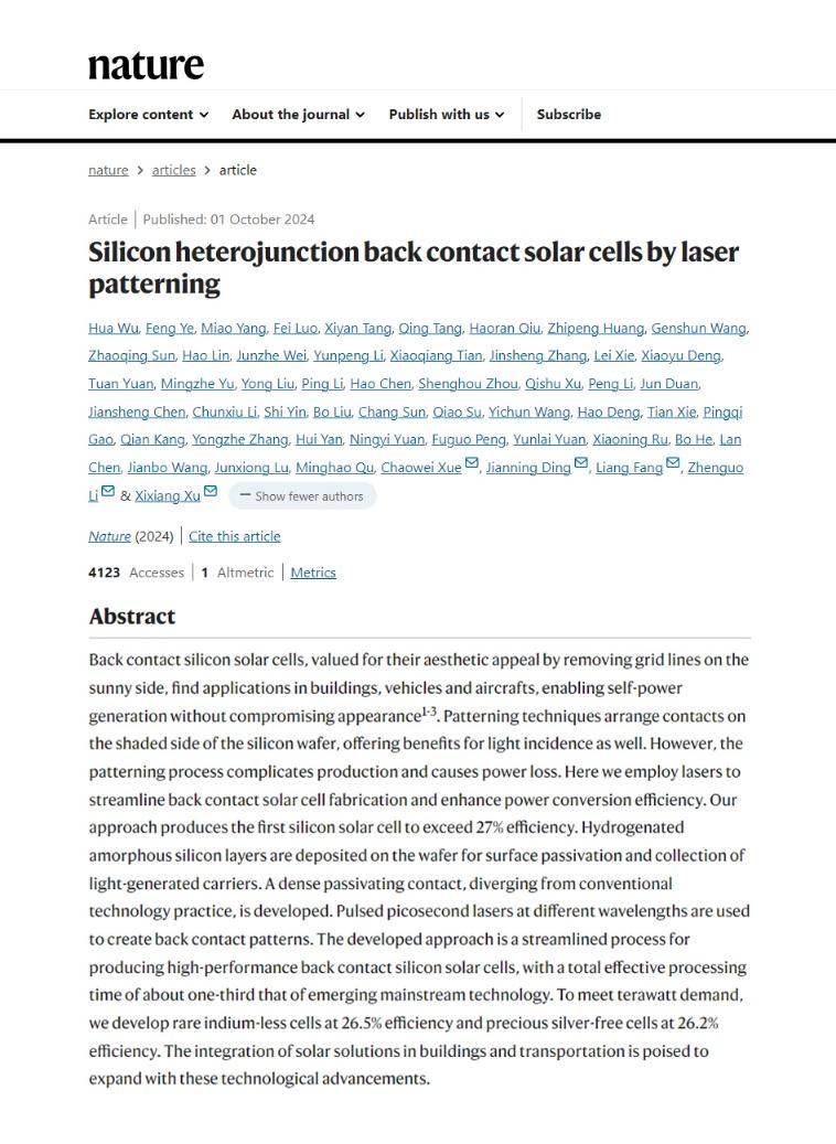 近日,隆基绿能科技股份有限公司(以下简称隆基)作为第一单位,在《自然》期刊在线发表研究论文,首次报道了通过全激光图形化工艺,使晶硅电池光电转换效率突破27%的研究成果。这一突破标志着晶硅太阳能电池效率首次超过27%,为基于晶硅材料的光伏技术和产业发展奠定基础。