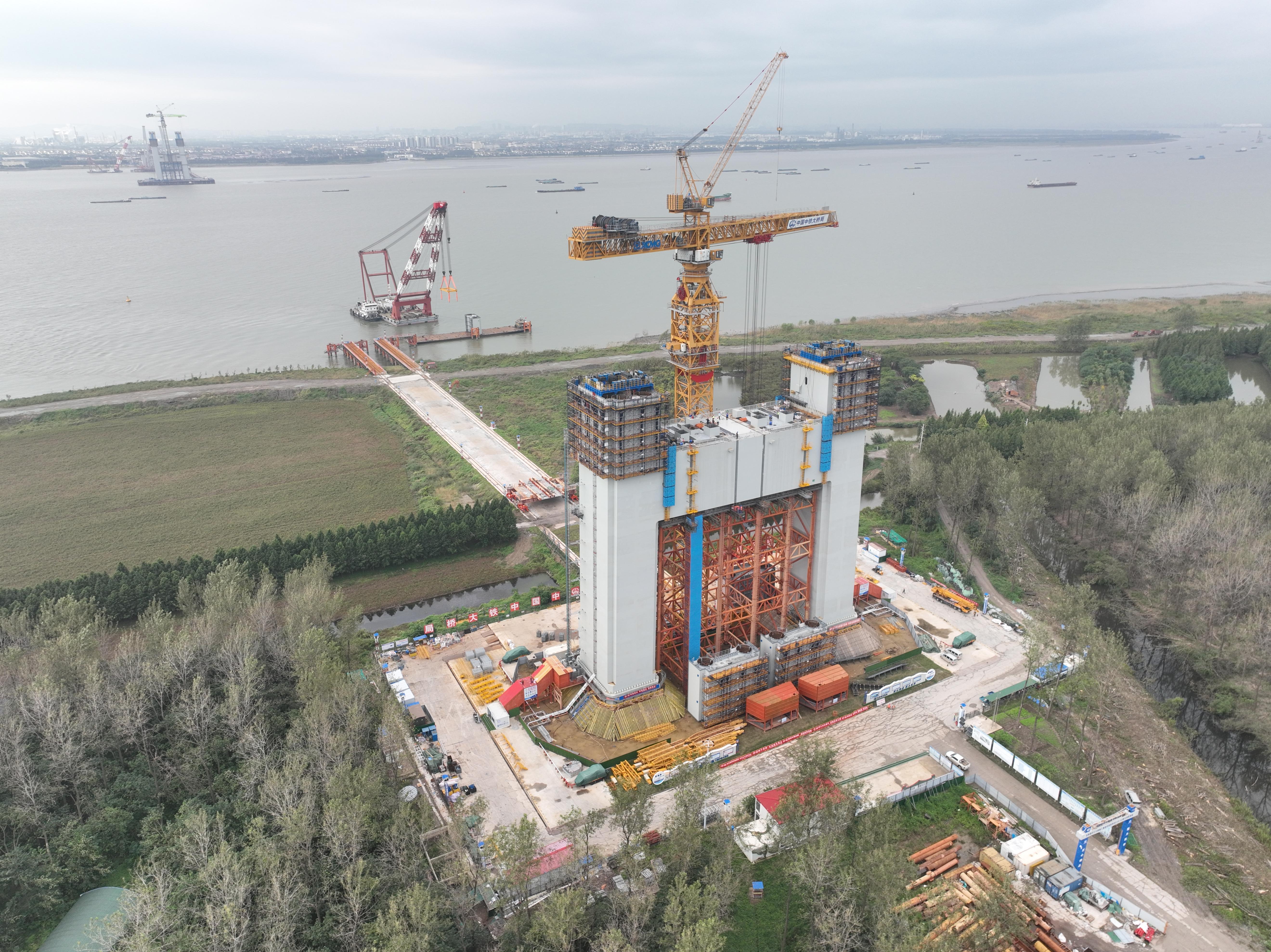 张靖皋长江大桥跨江段总长度达7859米,有南、北两座航道桥以及南、中、北三段引桥。令人瞩目的是,该大桥南航道桥的主跨达到了2300米,成为全球在建最大跨度的悬索桥。其中,矗立于马洲岛之上的南航道桥北主塔,是由中铁大桥局负责承建的。