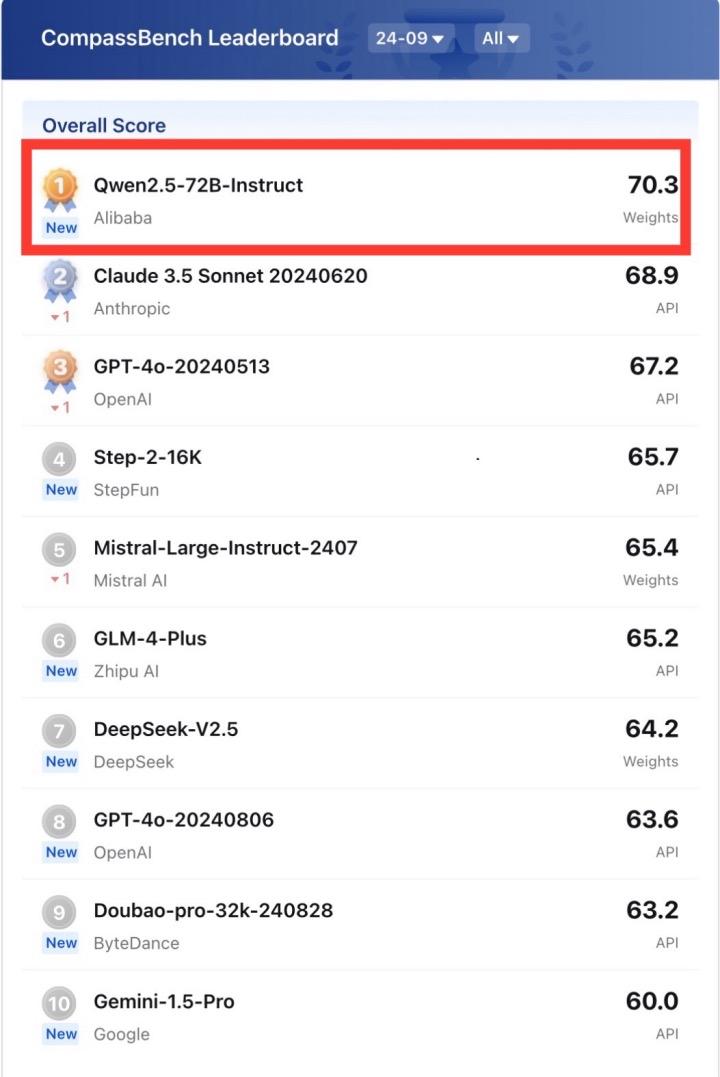 在2024年9月的司南OpenCompass榜单中,开源的Qwen2.5-72B以70.3分夺冠,首次超越Claude3.5和GPT-4o等闭源模型。Qwen2.5-72B-Instruct在此次榜单的多项能力测评中名列前茅。
