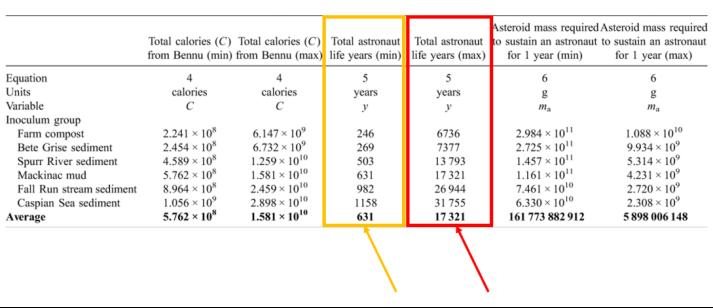 经过计算,他们发现,仅小行星贝努在最低效率情况下产生的生物质,足够631位航天员一年的食物消耗,而在最高效率的情况下,足够17000位航天员一年的食物消耗。