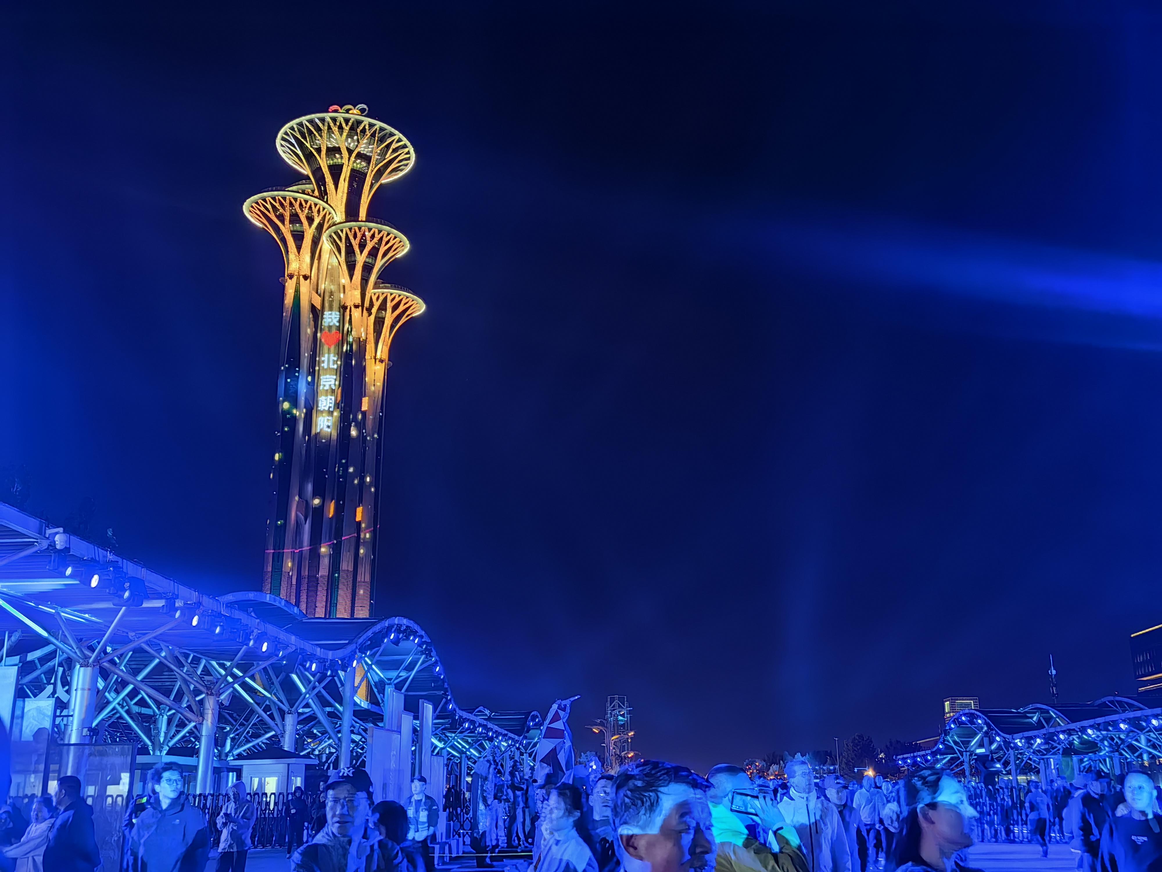 整个奥林匹克中心区的艺术装置充满“科技感”“国际范”。灯光艺术装置《生命之环》处,炫彩光影经由柔性LED天环、LED地幕,以及中央悬浮的“生命果实”,层层传递至奥林匹克塔,塔身化身为360度可见的光影载体,与奥海水幕组成“塔秀”“水秀”联动的光影秀。奥林匹克草坪区则分布着《Hulahoop 呼啦圈》《Nura》《Colour Cubed 色彩立方》等来自法国、澳大利亚国家的艺术作品。