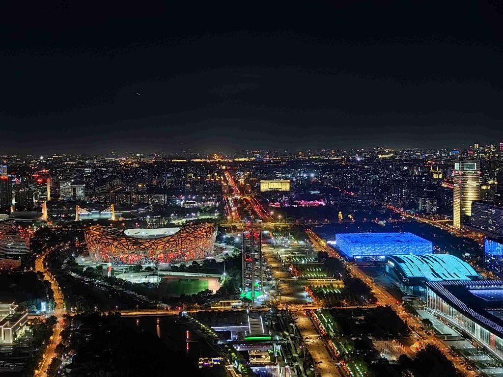 奥林匹克塔的观景平台是俯瞰中轴线与“生命之树”的最佳场所。从观景平台向下望去,目之所及皆为绚烂,奥林匹克中心区将中轴线延长线上最北端的奥森公园、奥林匹克塔、鸟巢、水立方、冰丝带等标志性地标建筑、光影艺术场景和文娱消费活动“串珠成线”,以光影艺术为媒介、以科技应用为依托,通过现代科技的炫酷展示与文化艺术的融合碰撞,令这条古老轴线焕发新的生机活力。