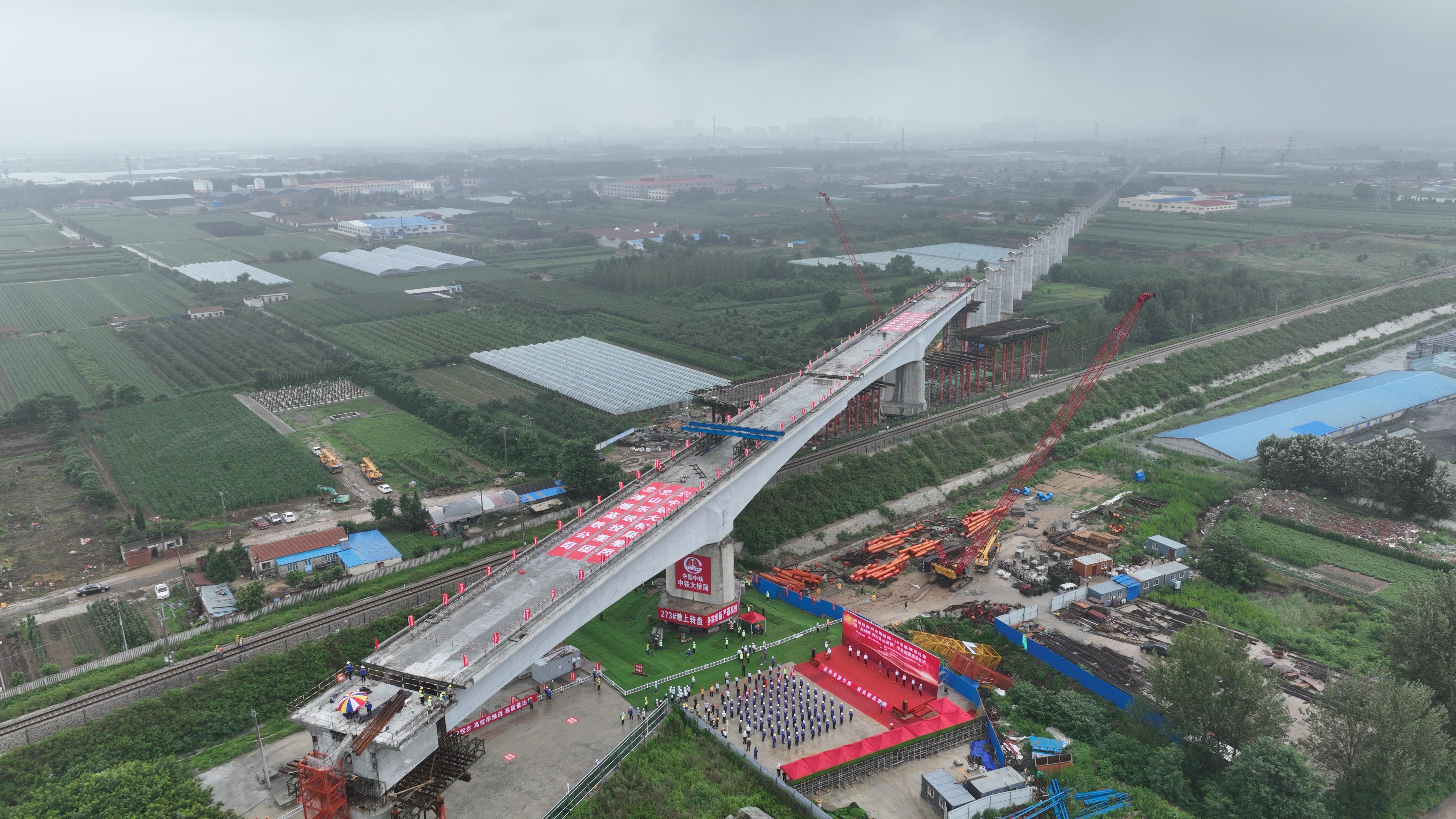 据了解,在潍烟高铁建设过程中,该项目人员运用新技术破解了不少施工难题。比如由中铁大桥局承建的潍烟铁路龙口段,线路全长28.73千米。作为潍烟高铁全线首个大跨度连续梁涉铁转体施工,跨龙烟铁路转体梁施工是潍烟高铁全线重点控制性工程,上跨龙烟铁路营业线,来往车次频繁,安全风险较高,为最大限度保障施工及车辆安全,中铁大桥局潍烟高铁3标项目经理包新宇表示,他们确定了连续梁采用转体法施工,即桥梁先在顺铁路方向线外采用支架现浇,浇筑完成后再通过转体装置转体,通过称重配重实现梁体平衡,通过试转验证工装性能,根据试转取得的工艺参数,实现转体姿态精确就位。2022年7月13日,在连续梁双“T”构同时旋转24度33分后,转体梁实现精准对接,圆满完成跨龙烟铁路转体梁施工。