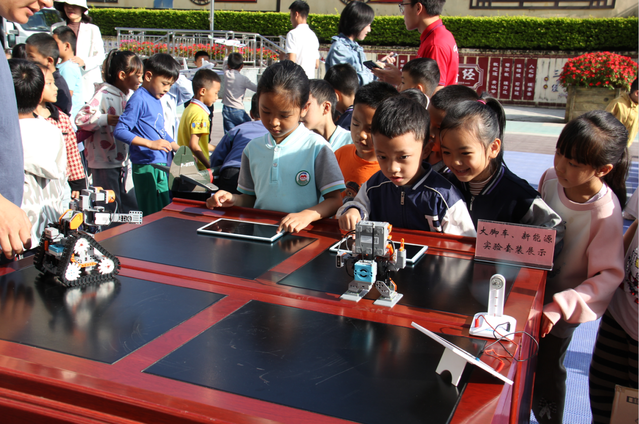 红河州中小学示范性综合实践基地和昆明北清中科教育科技有限公司带来的巡回展示同样吸引学生眼球。可视化模块编程让孩子循序渐进学习逻辑程序——星际探险教育机器人,高科技含量的科普教育活动——车辆模型运动,包含太阳能发电装置、风能发电装置以及氢能制备利用装置——新能源实验套装……一场场展示和互动,激发起孩子们了解奇妙世界的兴趣。
