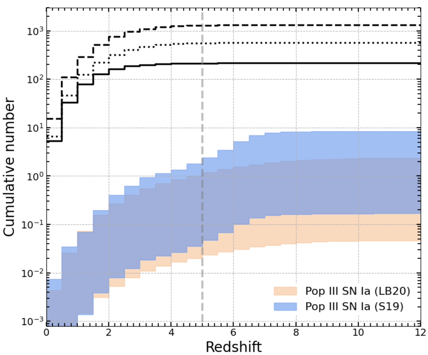 研究结果表明,第一代恒星产生的Ia型超新星的数目,与星族Ⅲ恒星的形成历史及初始质量函数密切相关。这类恒星以几乎没有金属污染的形式诞生,其主要成分为氢、氦和极少量的锂。在研究模型中,星族Ⅲ恒星产生的Ia型超新星数目与星族Ⅰ、Ⅱ恒星在高红移处产生的Ia型超新星数目相当,这意味着它们有望被性能强大的詹姆斯·韦布空间望远镜(JWST)发现。