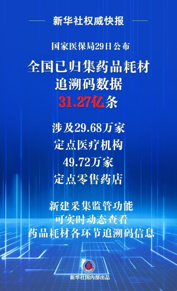 国家医保局29日公布,全国已归集药品耗材追溯码数据31.27亿条,涉及29.68万家定点医疗机构,49.72万家定点零售药店。