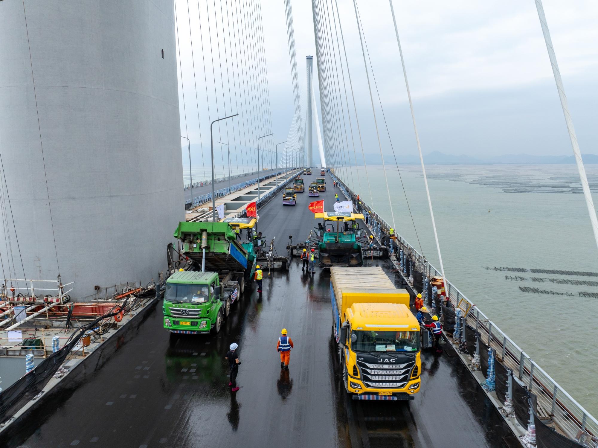 10月29日上午,粤港澳大湾区重点工程黄茅海跨海通道项目顺利完成黄茅海大桥右幅钢桥面沥青摊铺,标志着项目全线铺装工程全部完成。