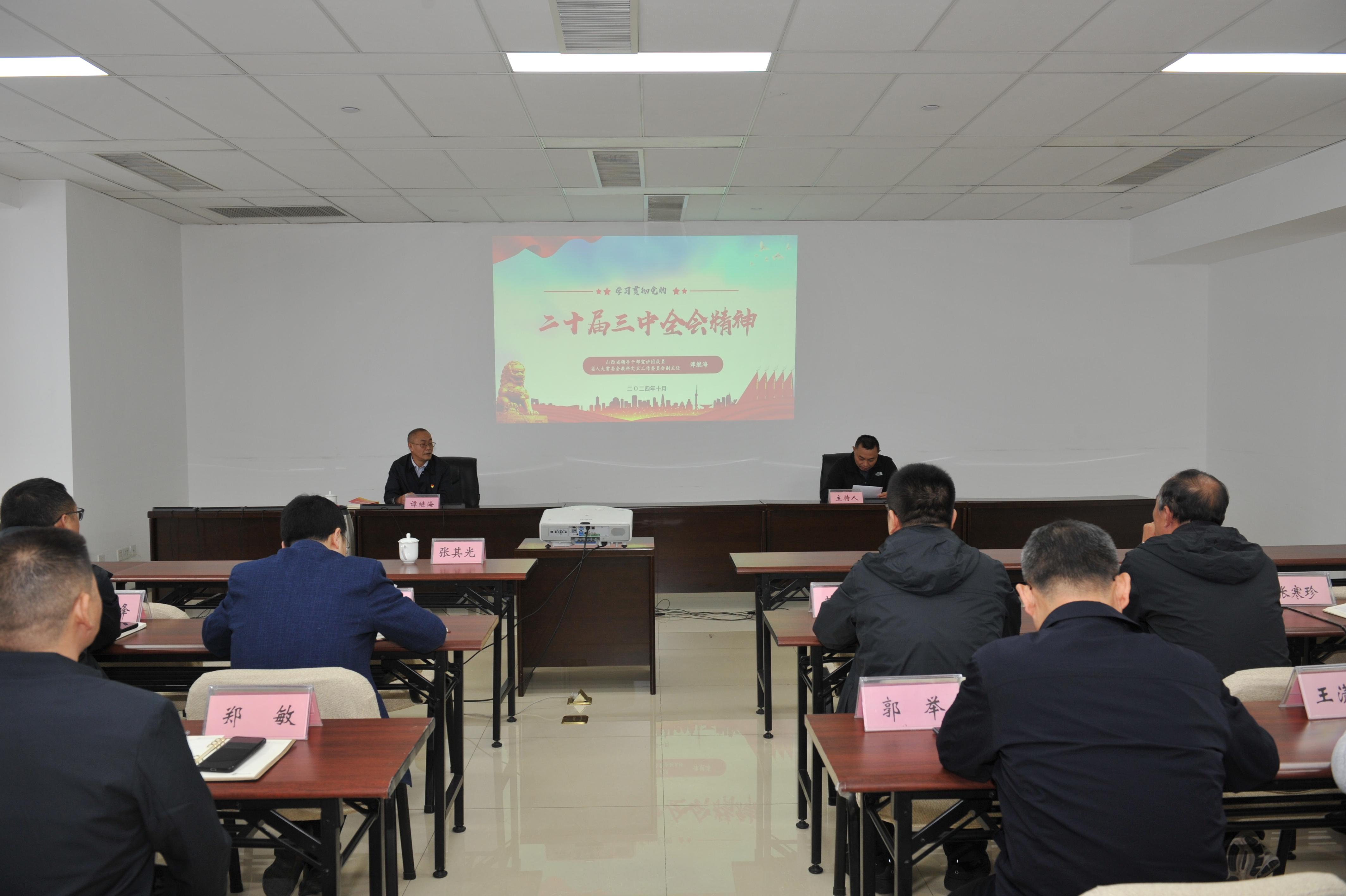 为持续深入学习贯彻党的二十届三中全会精神,根据《山西省学习贯彻党的二十届三中全会精神基层宣讲工作方案》要求,10月25日,“百人百场报告会”进基层宣讲活动来到山西省科技厅,省领导干部宣讲团成员、山西省人大常委会教科文卫工委副主任谭继海以“学习贯彻党的二十届三中全会精神”为题进行了宣讲授课。该厅领导班子成员、厅机关党员干部、各直属单位班子成员,以及厅系统青年理论学习小组青年代表共同聆听宣讲报告。