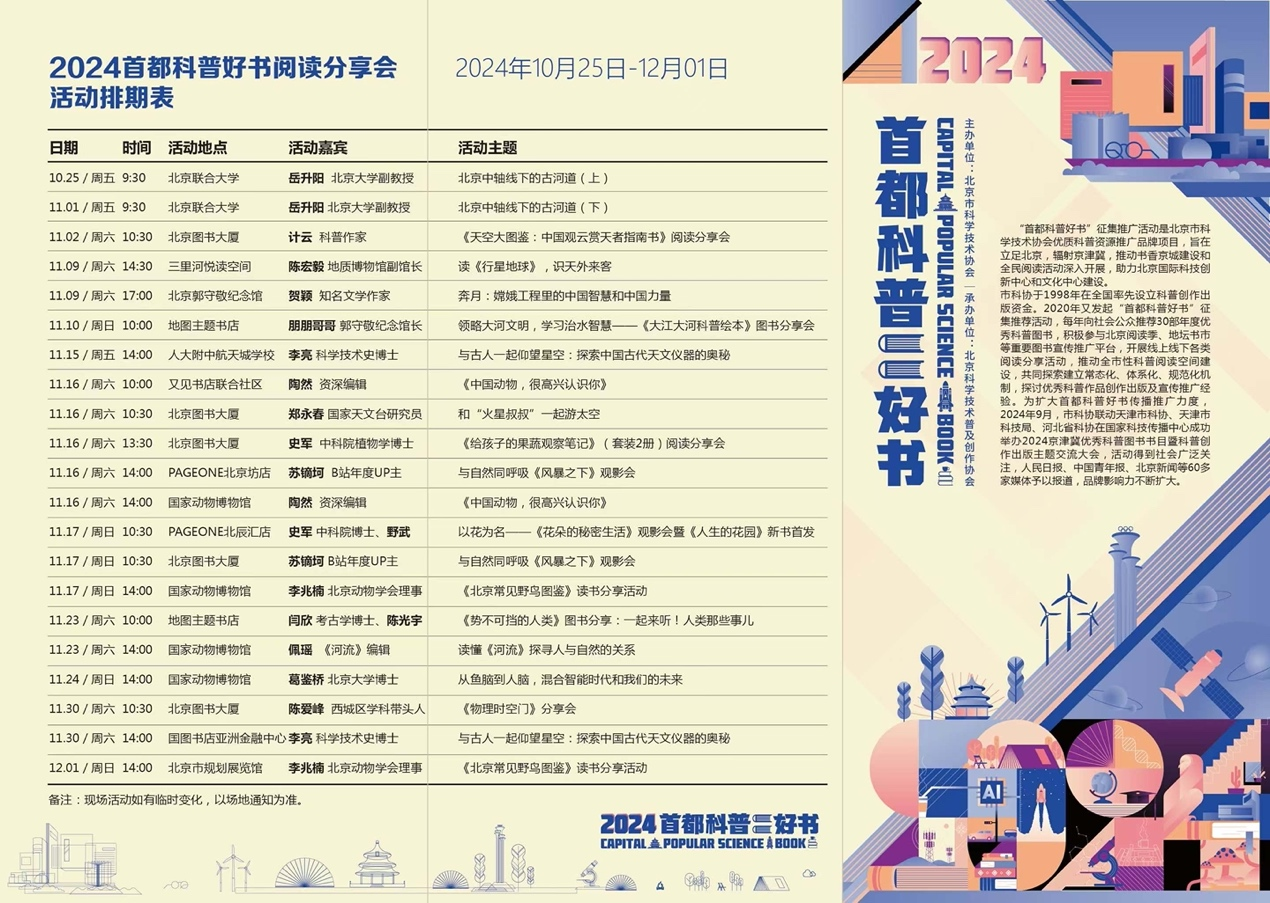 据介绍,“2024首都科普好书”阅读分享会,将邀请入围科普图书作者、译者、编者,知名阅读推广人以及科普专家,面对面互动交流,为公众带来一场场精彩纷呈的科普盛宴。年底前,活动将在30家科普阅读空间陆续举行,同期还将在天津、河北两地开展科普好书进校园活动。