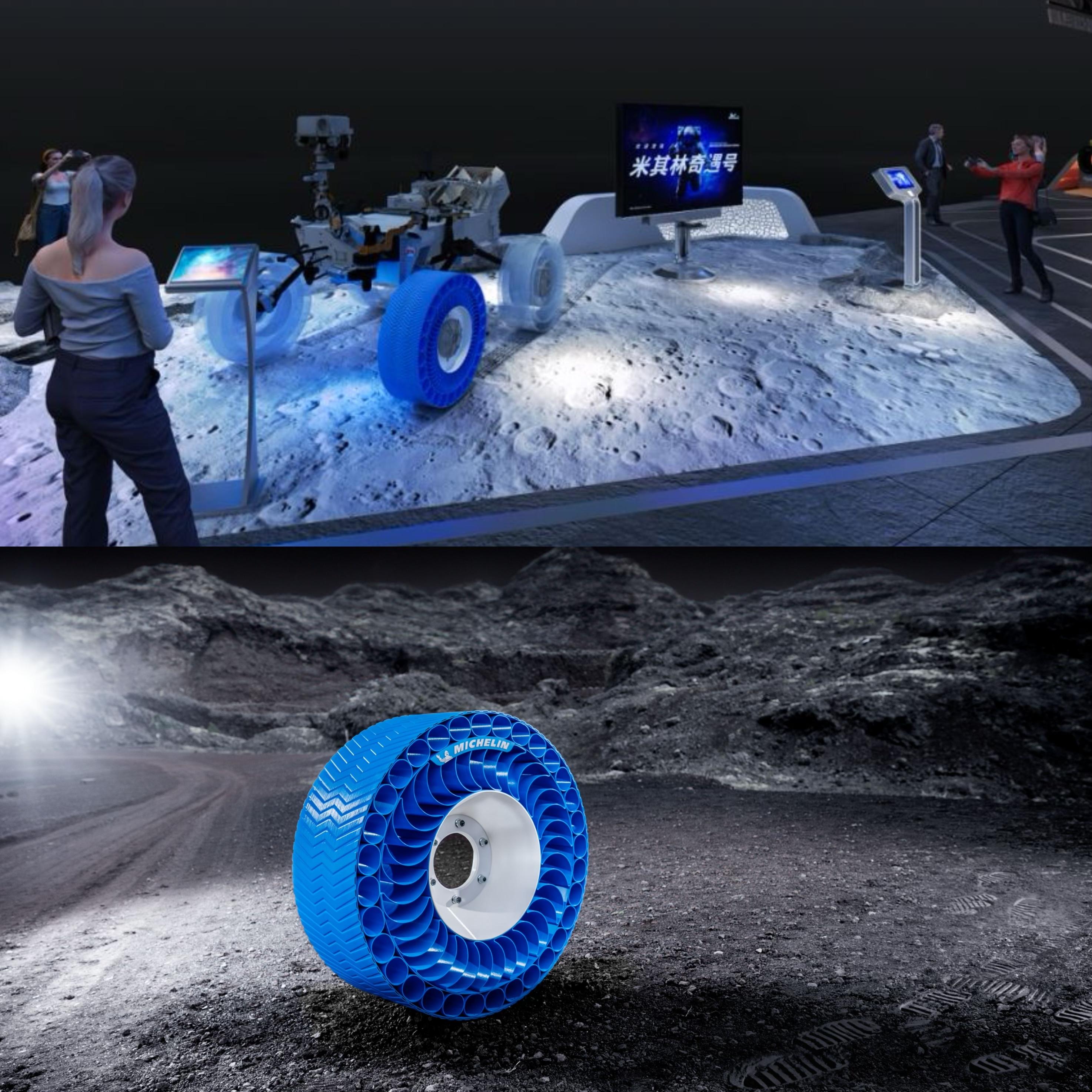 作为进博会汽车展区的老朋友,米其林今年设计打造了“米其林奇遇号”主题展台。米其林正在为月球探测车研发免充气轮胎,并在第七届进博会上亚洲首秀这款为月球使用环境而研制的原型胎。