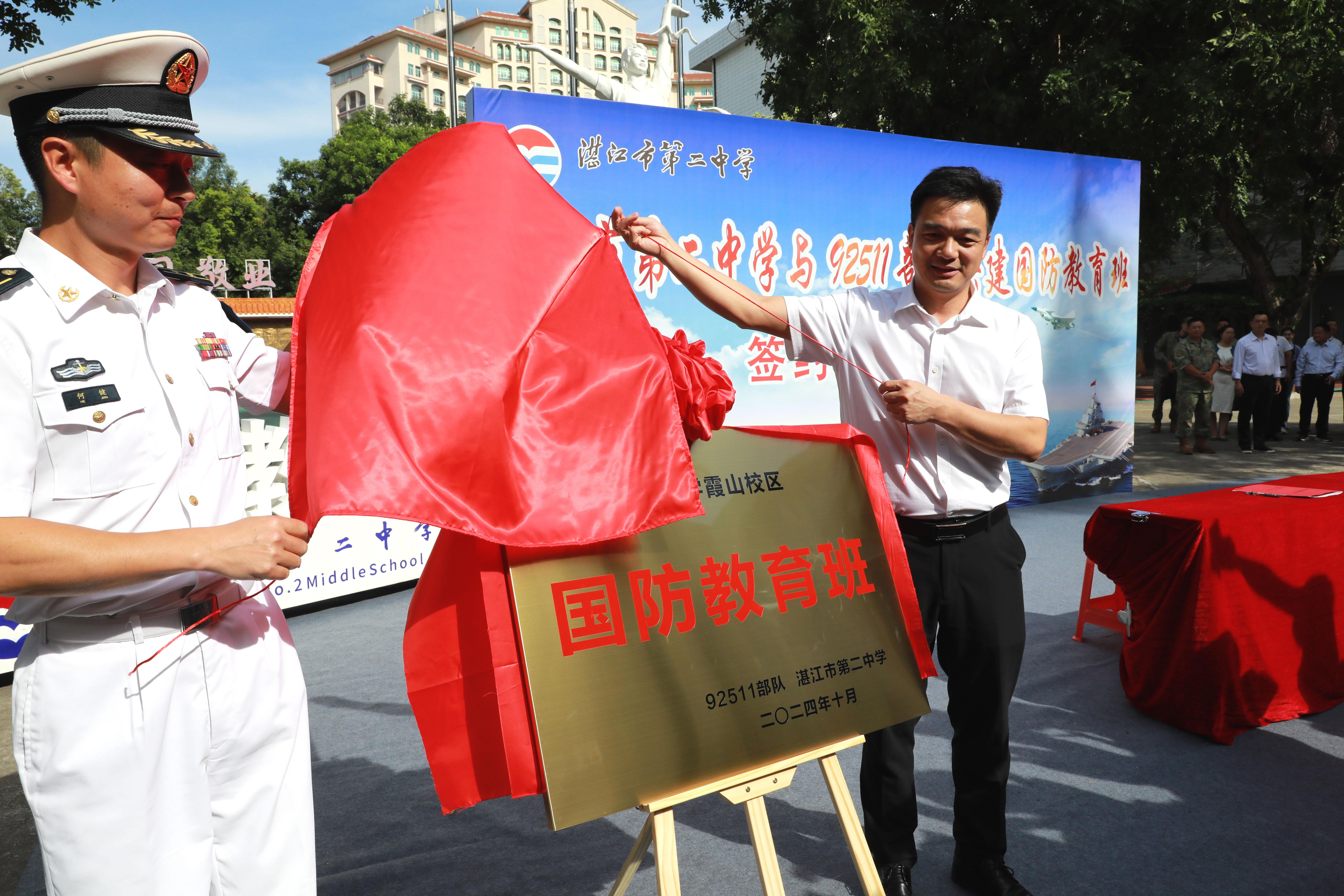 在湛江市第二中学与南部战区海军某部举行共建“国防教育班”签约揭牌仪式上,部队代表何健表示,希望在同学们心中播下热爱国家、热爱军队、热爱海洋的种子。下一步,我们将与学校携手同行,共同探讨更加丰富多彩的共建共育活动,切实推动国防教育普及深化。