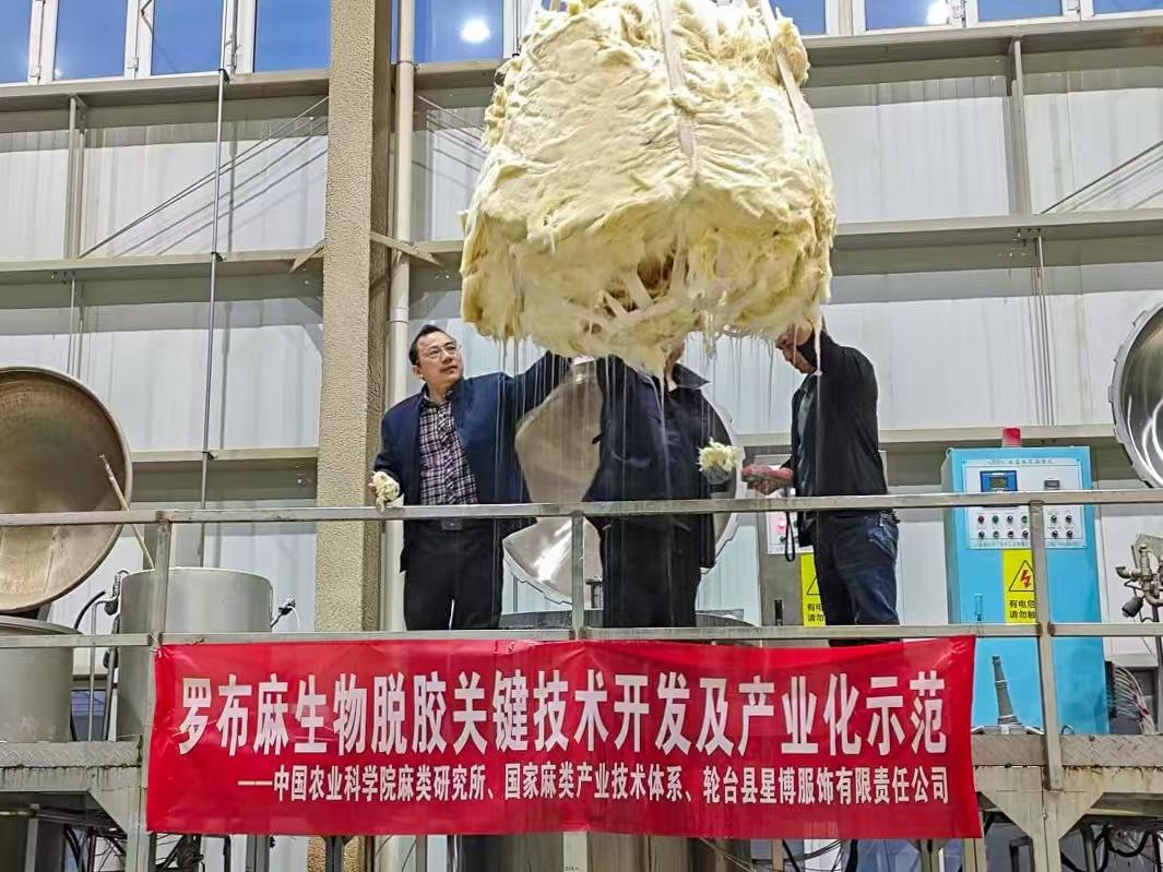 为突破纤维脱胶这一制约产业发展的技术难题,尉犁县政府积极促成合作,由中国农业科学院麻类研究所、国家麻类产业技术体系、新疆致博服饰科技有限公司及轮台县星博服饰有限责任公司四方携手努力,共同研发出了罗布麻生物脱胶技术。