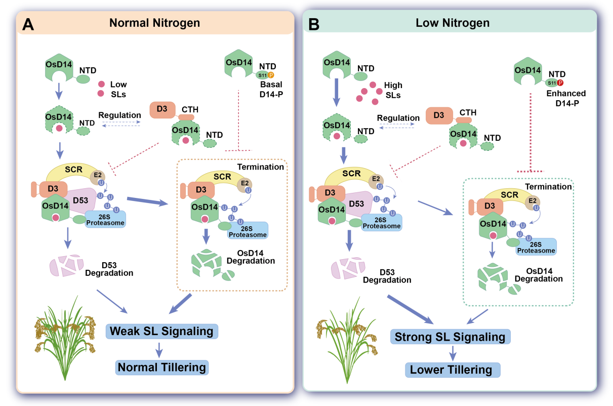 此次,科研人员阐明了水稻中由独脚金内酯受体D14介导的信号感知的激活、调控和终止机制,解决了独脚金内酯信号感知机制的争议问题,发现在泛素化修饰和蛋白降解之间新的调控机制,并揭示了D14通过磷酸化调控自身稳定性的新机制,以及该机制在水稻分蘖响应低氮环境中的核心作用。