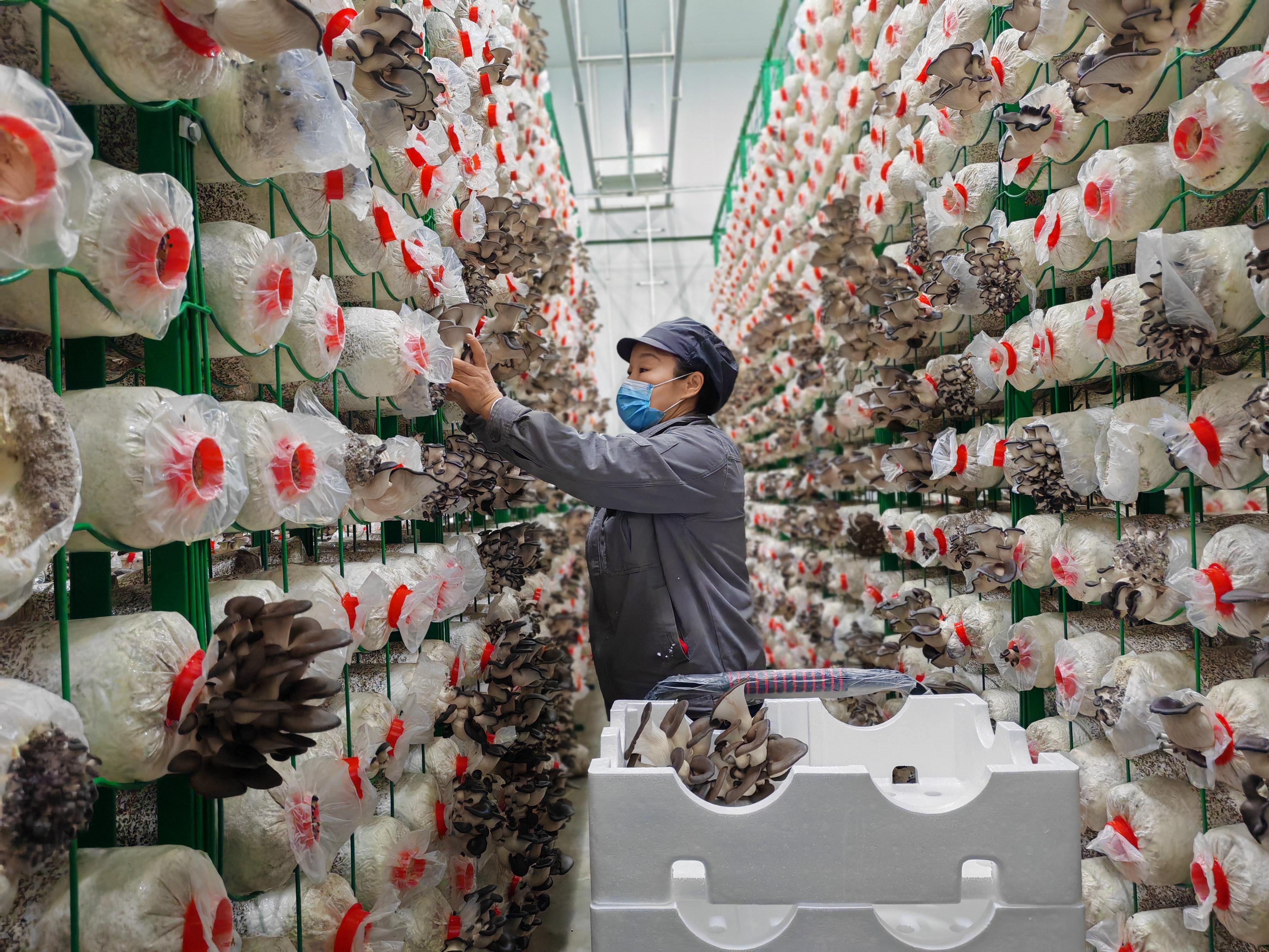 生产车间里,一排排菇架整齐排列,灰褐色的平菇长势喜人。工人们正忙着采摘、打包,把蘑菇发往周边城市。