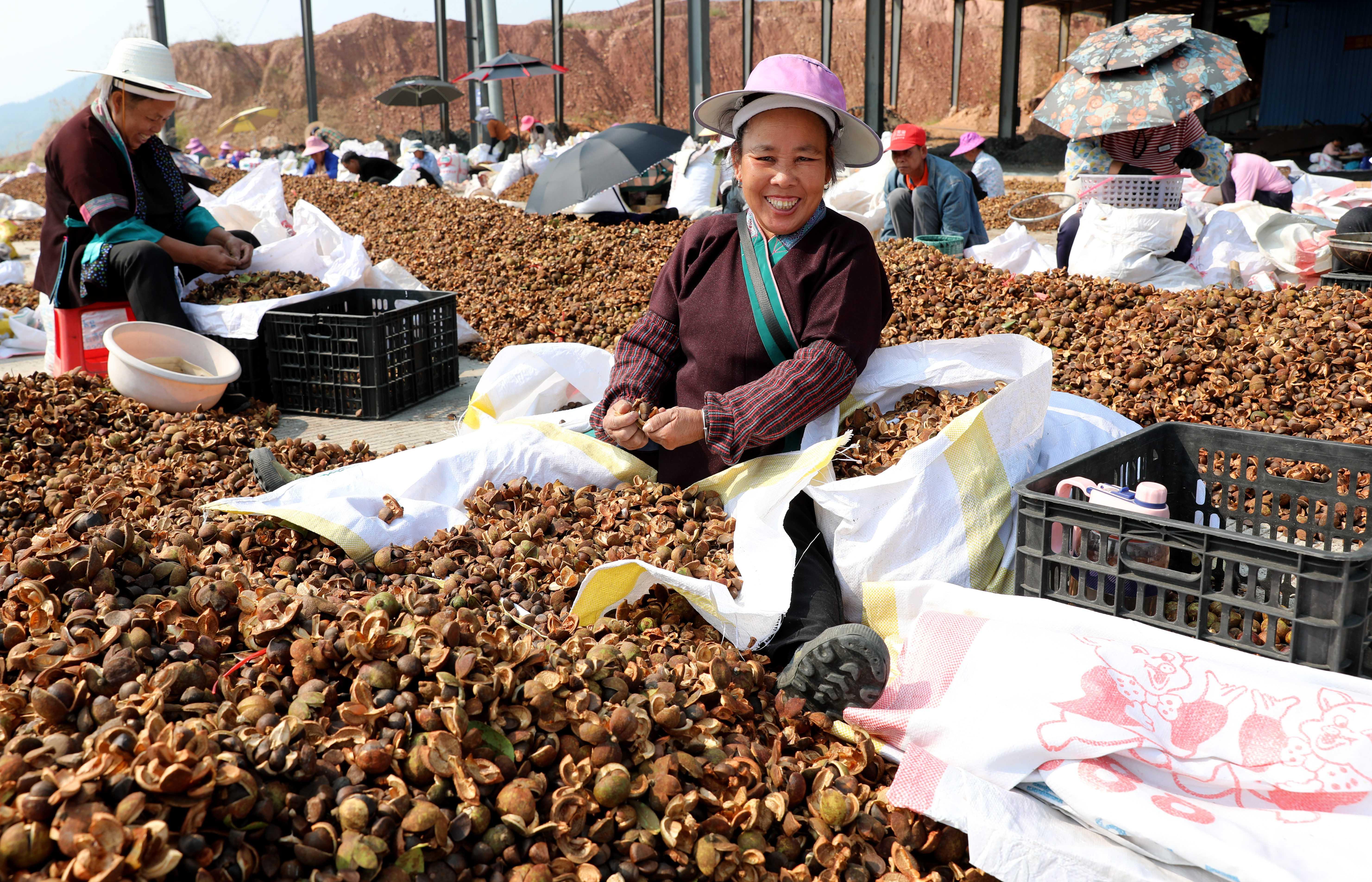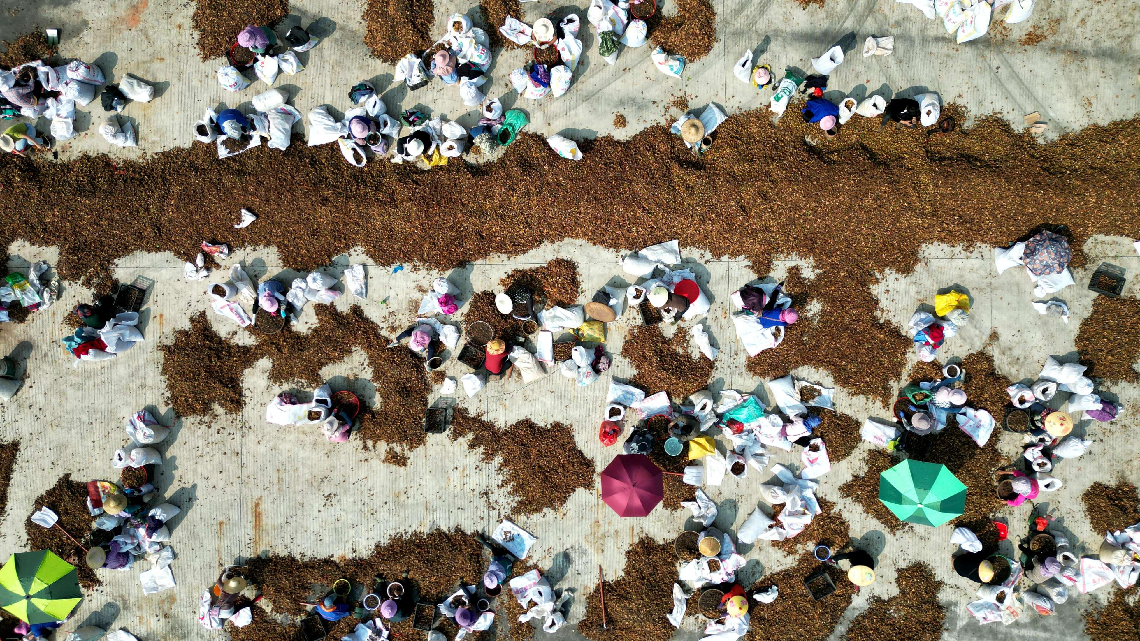 11月6日,侗乡群众在广西三江侗族自治县程村工业园区油茶晾晒场分拣油茶籽,为油茶精深加工做好准备。