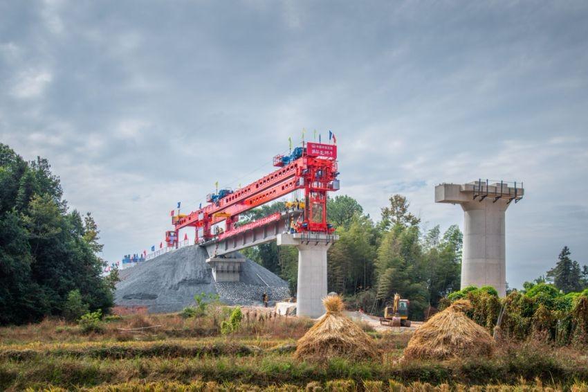 11月10日,在江西省瑞金市瑞梅铁路武阳大桥施工现场,随着作业人员操纵着JQT180型架桥机将一片重达143吨的32米预应力简支T梁稳稳架设在桥墩上,标志着瑞梅铁路开始架梁,正式由线下施工转入线上铺架施工。新建瑞梅铁路是国家“十四五”重点工程项目。