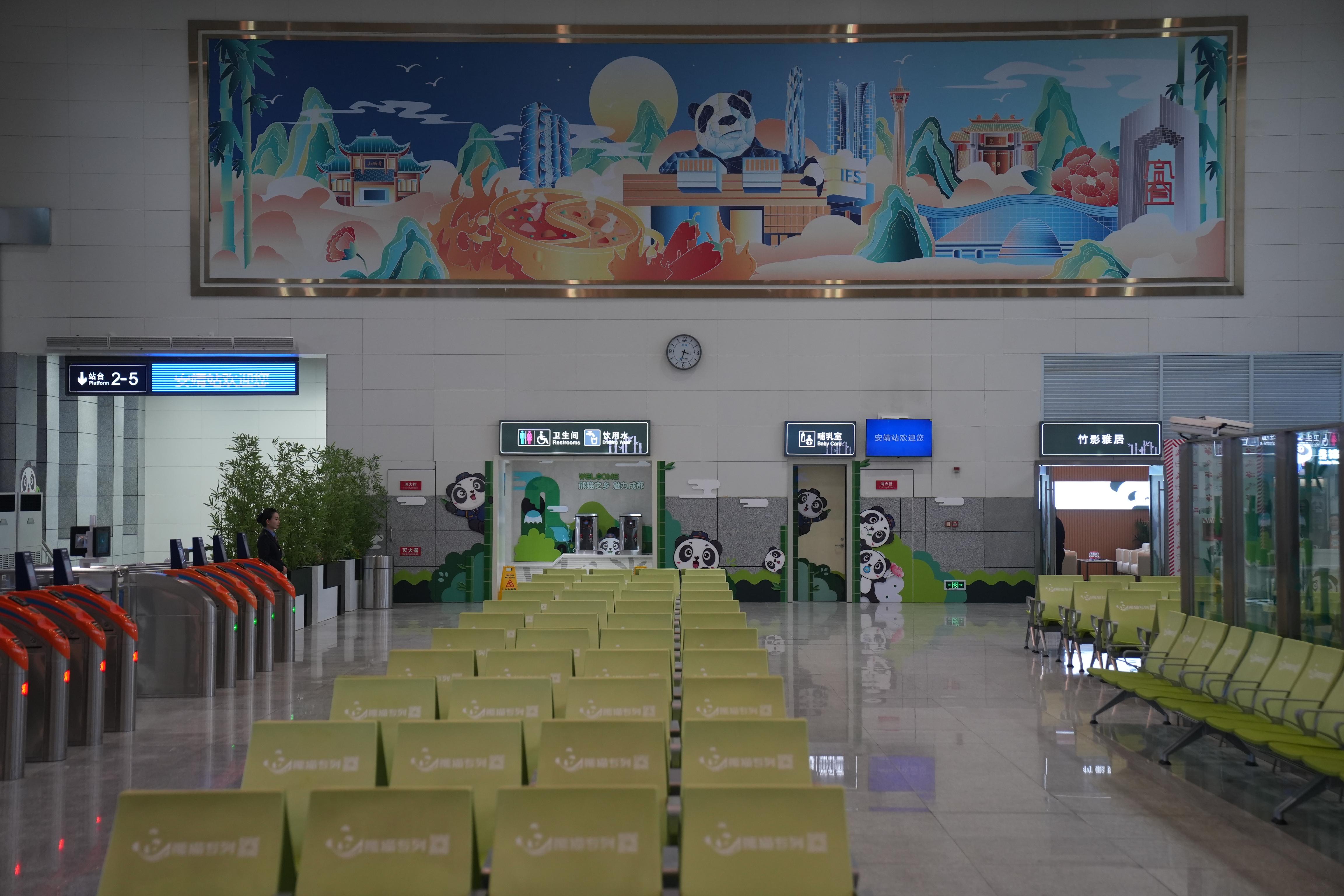 中国铁路成都局集团有限公司成都车站安靖站站长施洋介绍,安靖站的整体设计突出了成都“熊猫之都”的地域文化,将为游客提供独具特色的候车体验。车站外观设计成“熊猫专列”车厢,可爱的熊猫头像、香槟金饰面和竹叶丝带等元素相互融合,营造出温馨有趣的氛围;站内基础设施、服务设备、旅游氛围等运用大量熊猫元素;站前广场处还设置了熊猫立体雕塑打卡点,让游客在第一时间感受到成都的文化魅力。