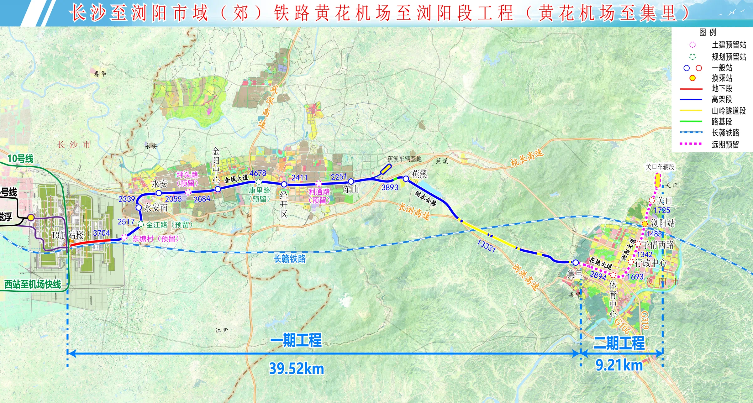 据悉,线路起于长沙黄花机场T3航站楼,串联浏阳金阳新城,终点抵达浏阳主城区,全长48.73公里,共设站12座。项目分两期建设,目前开工的一期工程将建设黄花机场至集里段,线路长度39.52公里,设站7座,预计2029年建成通车。