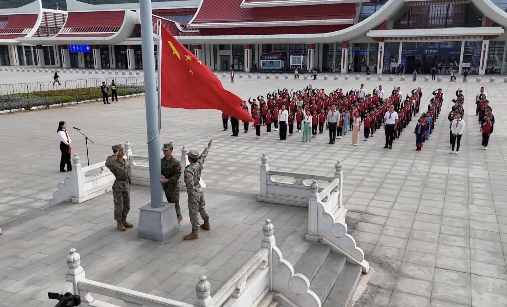11月12日,“红领巾爱祖国——我心中的五星红旗”国旗传递活动,在中老铁路最美“国门”第一站——磨憨站举行。