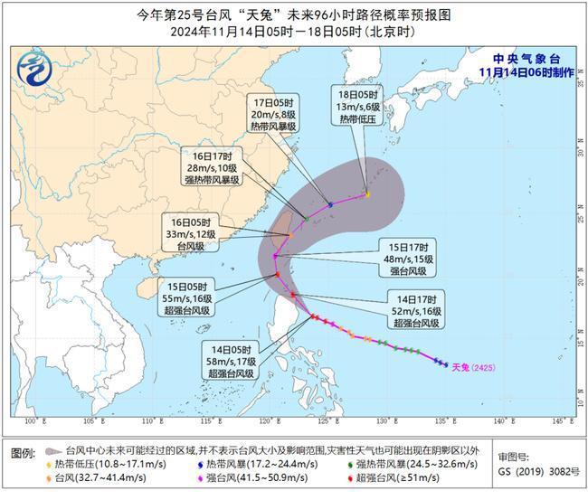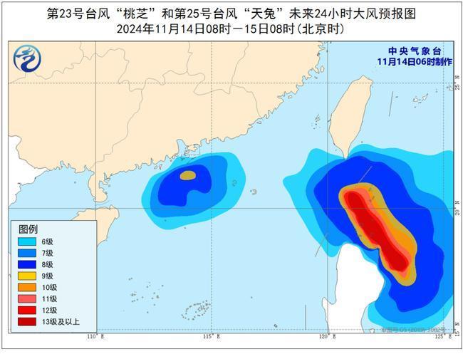 大风预报:14日08时至15日08时,巴士海峡、南海北部、广东中部沿海将有6-8级大风,阵风8-10级,其中南海西北部及巴士海峡部分海域的风力有9-11级,阵风11-13级,“天兔”中心经过的附近海域风力可达12-16级,阵风14-17级。