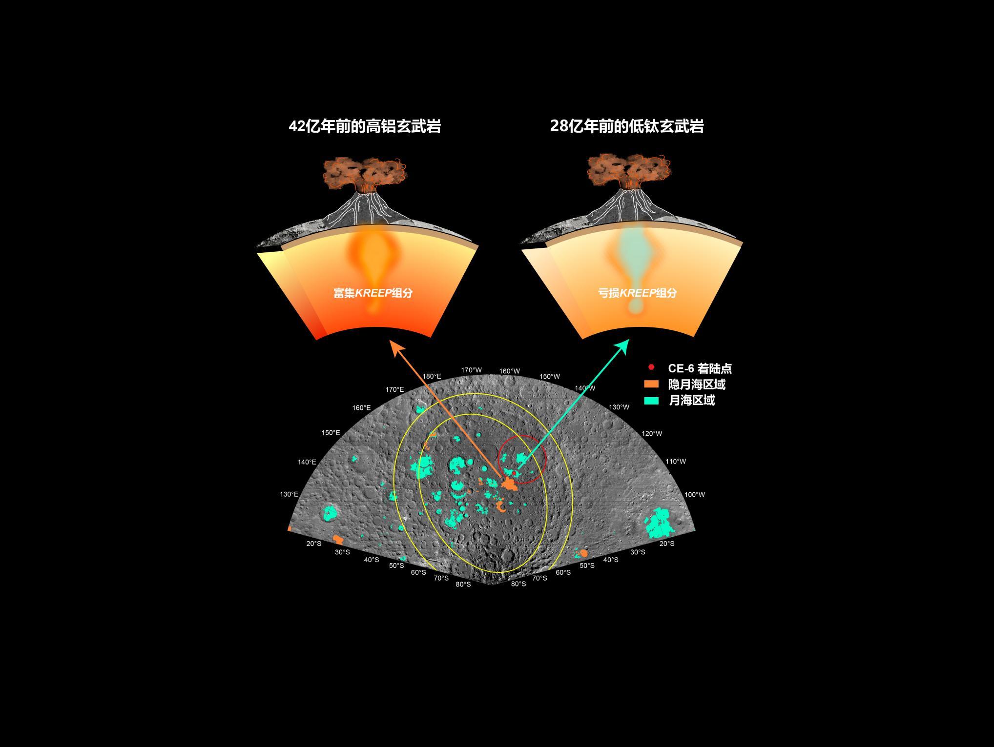 在发表于《自然》的研究中,中国科学院院士、中国科学院地质与地球物理研究所研究员李献华,中国科学院地质与地球物理研究所研究员李秋立以及来自中国科学院国家天文台的研究团队,根据5克月壤中分选出大于300微米的108颗玄武岩岩屑定年研究的结果,揭示嫦娥六号着陆点28亿年前存在火山活动,且岩浆来自亏损克里普物质(KREEP,富集钾(K),稀土(REE)和磷(P)等元素的物质)的源区;其中一颗高铝玄武岩岩屑揭示42亿年前存在来自富集克里普物质源区的火山活动。