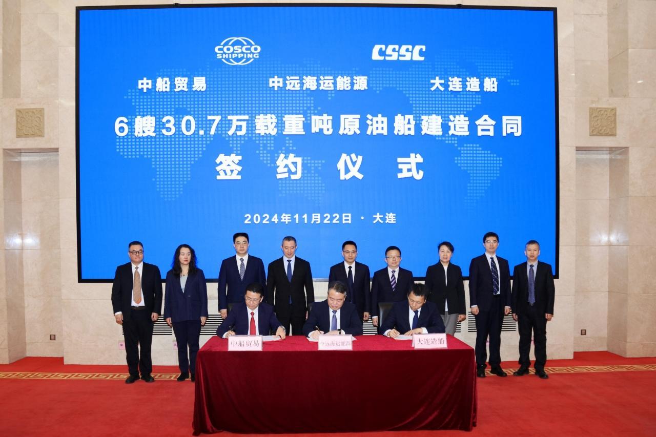 11月22日,中国船舶所属大连船舶重工集团有限公司(以下简称大连造船)联合中船贸易,与中远海运能源成功签署6艘30.7万吨原油船建造合同。项目将悬挂五星红旗,采用人民币结算,总计合同金额超57亿元。30.7万吨原油船是在国际航运业碳减排加速的背景下,大连造船基于船东需求,自主开发的全新一代超大型原油船。
