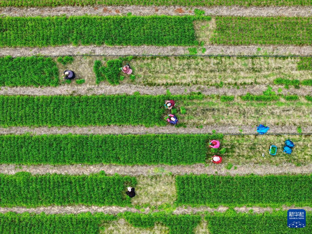 11月23日,在江苏省泰州市姜堰区蒋垛镇盐大村,农民在田间收获韭菜(无人机照片)。