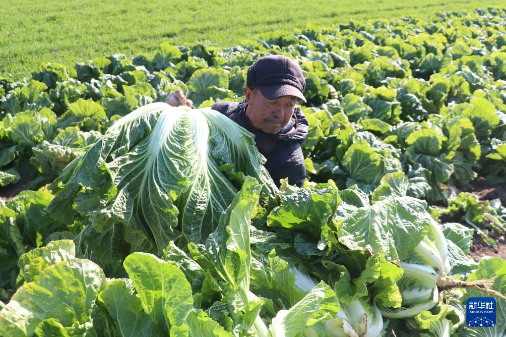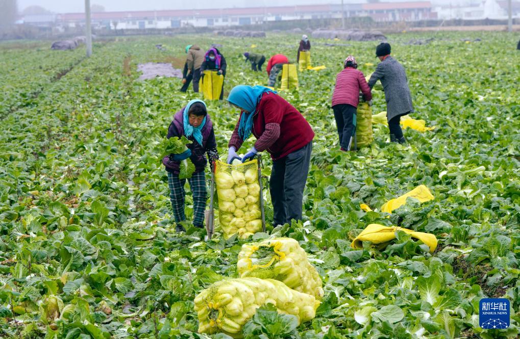 11月23日,在山东省胶州市胶北街道和睦屯村,村民在采收大白菜。