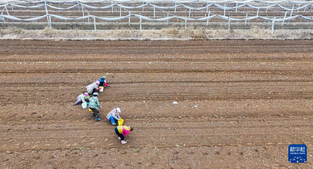 11月24日,河北省遵化市东新庄镇农民在田间收获中药材(无人机照片)。