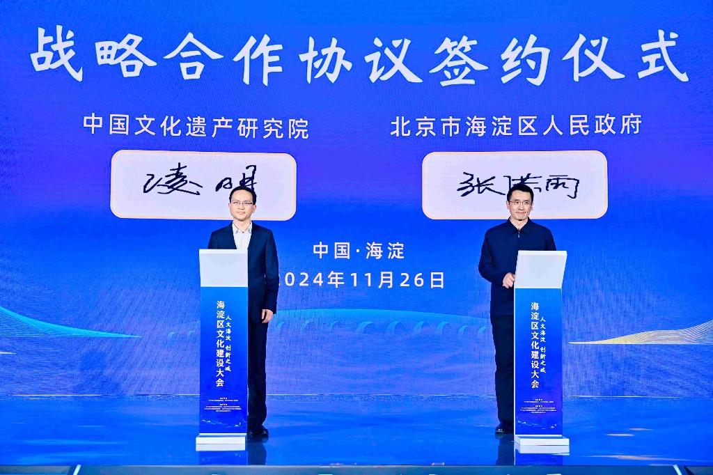 现场,海淀区政府与中国文化遗产研究院签署战略合作协议,双方将以三山五园国家文物保护利用示范区为重点,围绕文化遗产研究、文物保护利用、修缮、交流、可持续发展等方面开展全方位战略合作,共同拓展文物保护与活化利用新思路。