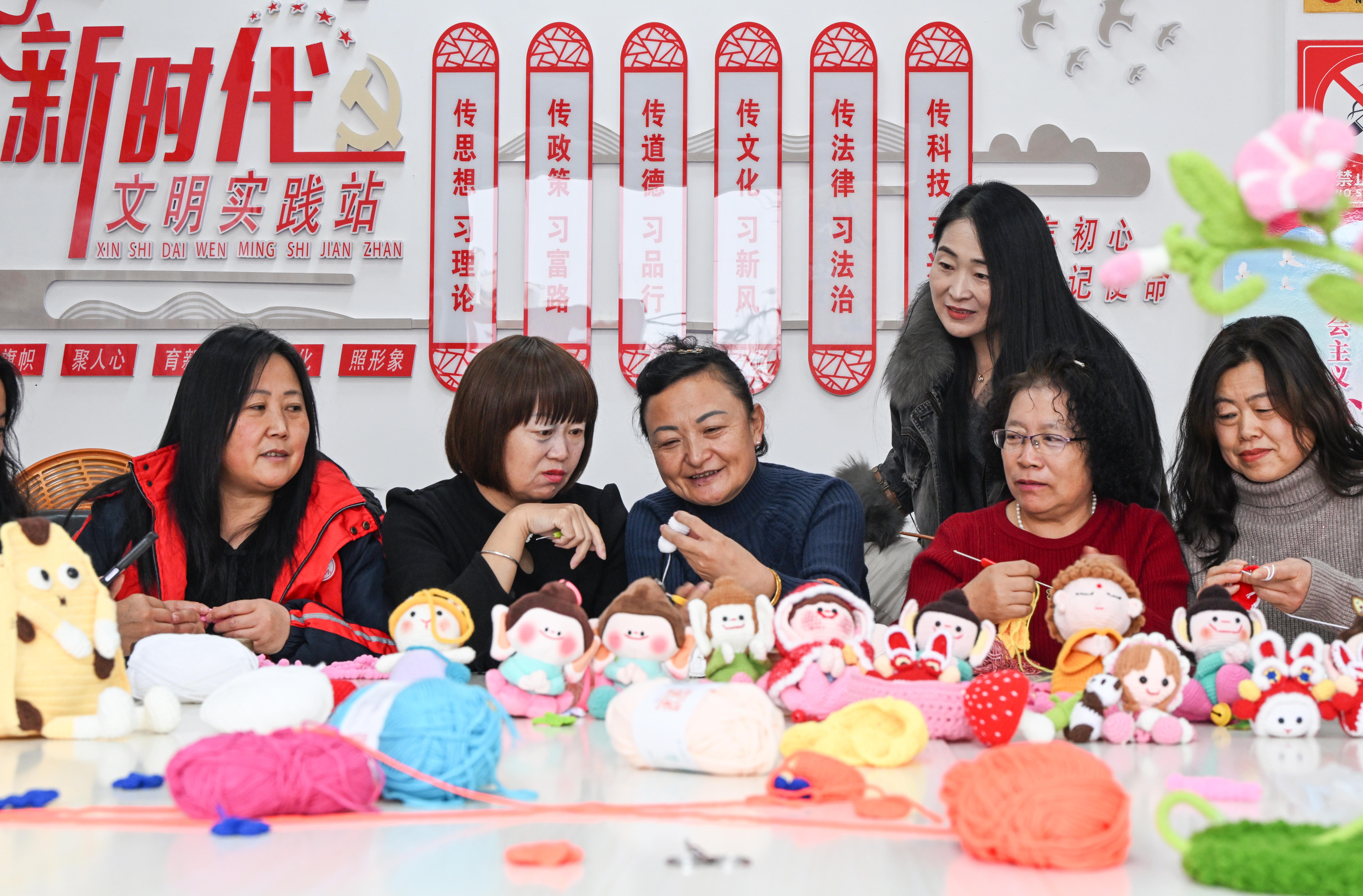 日前,记者来到大同市云州区吉祥里新时代文明实践中心,“云州巧婆娘”手工团队的十几名成员正在与培训老师学习手工钩织技巧。