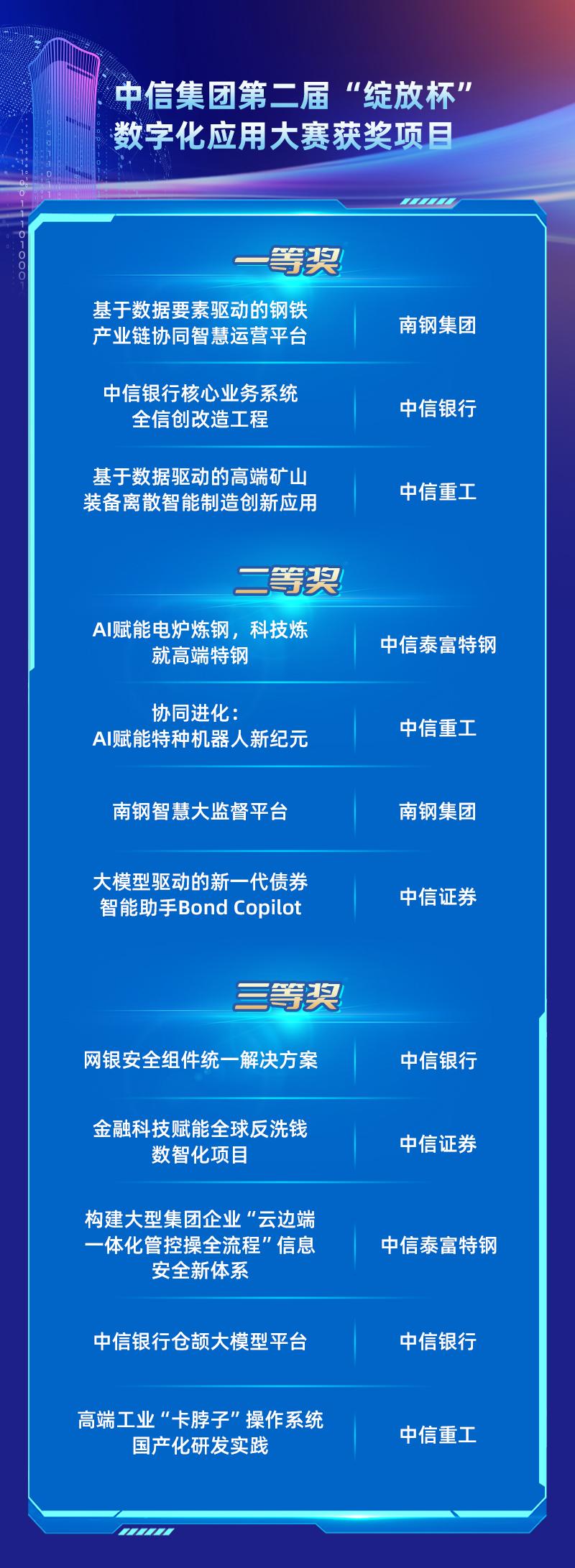 据介绍,“绽放杯”大赛是中信集团“十四五”数字化发展规划“应用绽放”行动的组成部分,连续两届比赛挖掘培育了一批在不同业务领域中示范效应强、综合效益好、发展潜力大的数字化应用,为以数字化推动传统产业转型升级提供借鉴和引领。