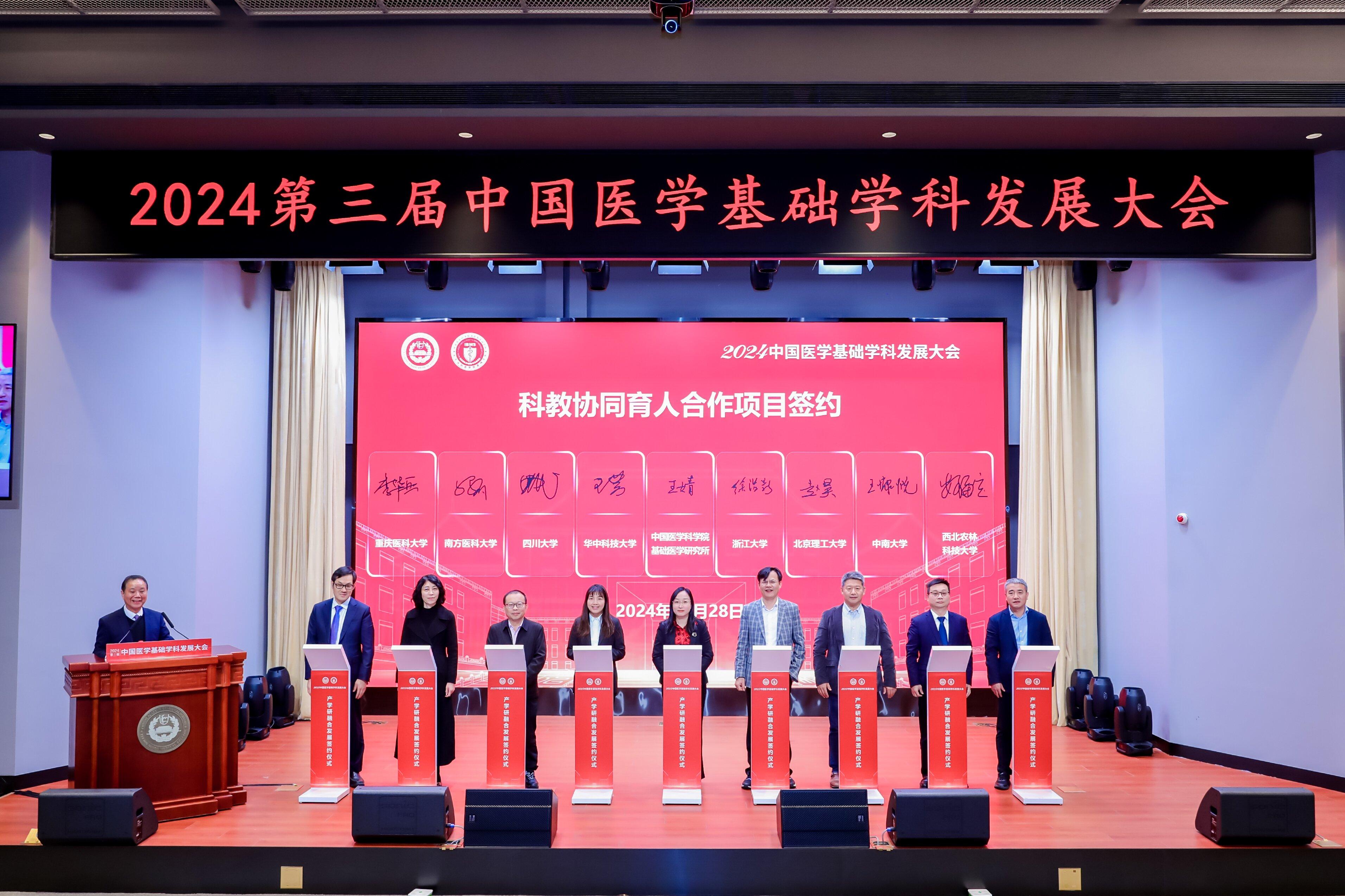 会议现场举行了“产学研融合发展”集体签约仪式。基础所院与浙江大学、华中科技大学等签署合作协议,进一步促进人才培养和科学研究紧密互动;基础所院与北京三元基因药业股份有限公司、北京神州细胞生物技术集团股份公司等签署合作协议,在科学研究、知识产权与成果转移转化、人才培养实训基地等方面开展合作。
