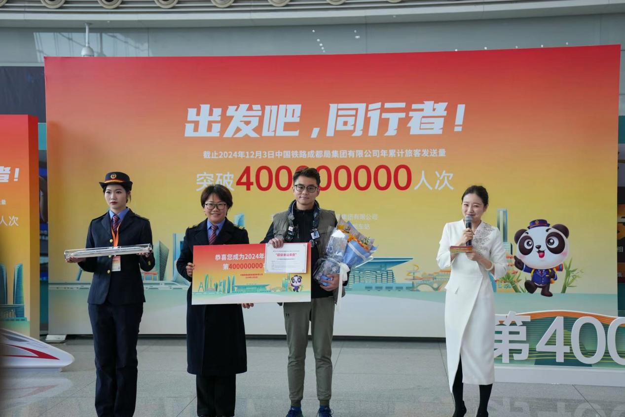 12月3日上午11时18分,随着G8613次列车从成都东站发车前往重庆市沙坪坝站,中国铁路成都局集团公司(以下简称“国铁成都局”)年旅客发送量首次突破4亿人次,打破2023年旅客发送量3.78亿人次历史纪录,创年旅客发送量新高。