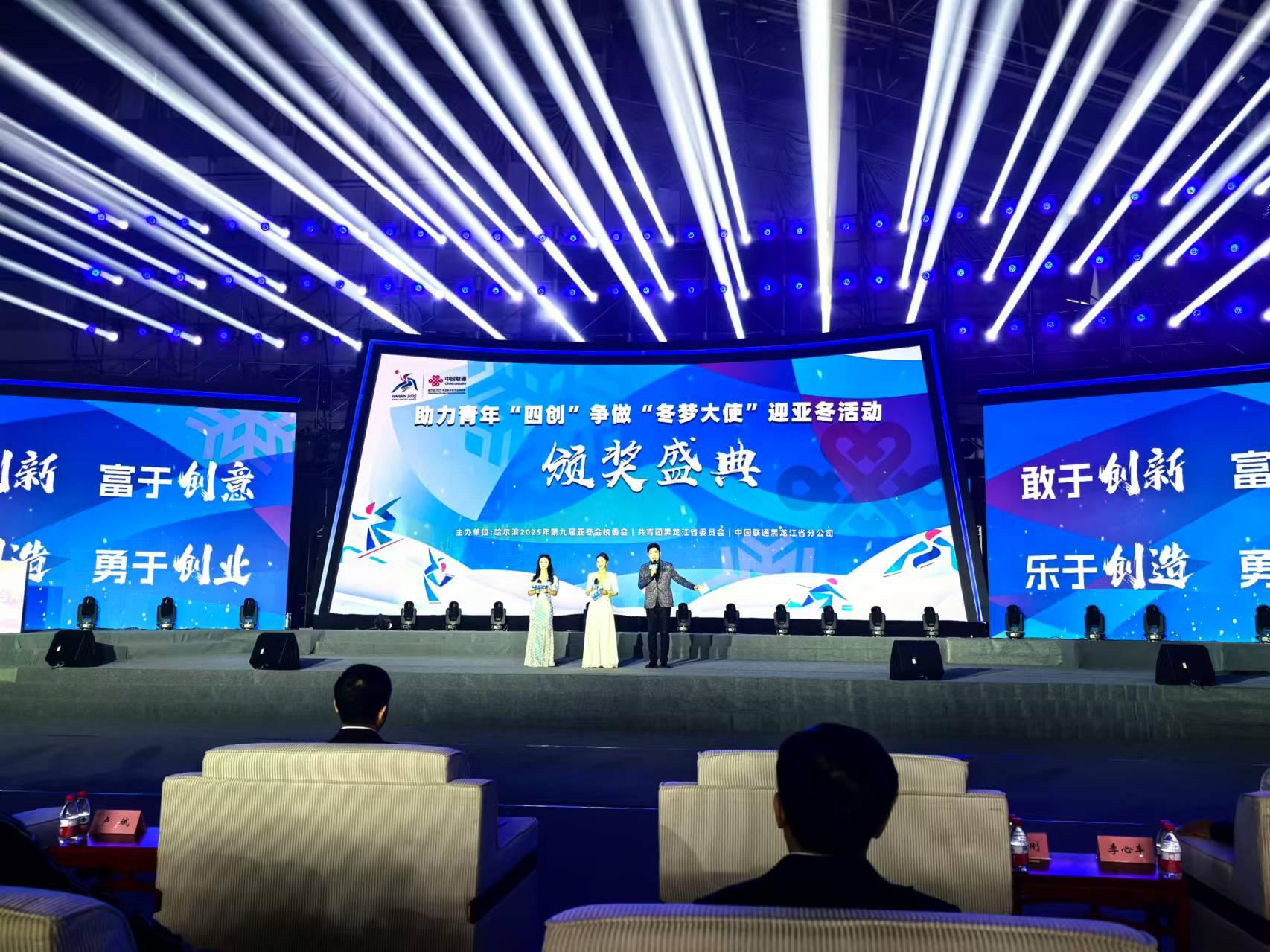 12月4日,“助力青年‘四创’ 争做‘冬梦大使’”颁奖盛典在黑龙江大学举行。本次活动由中国联通携手2025年第九届亚洲冬季运动会执行委员会及共青团黑龙江省委共同举办。