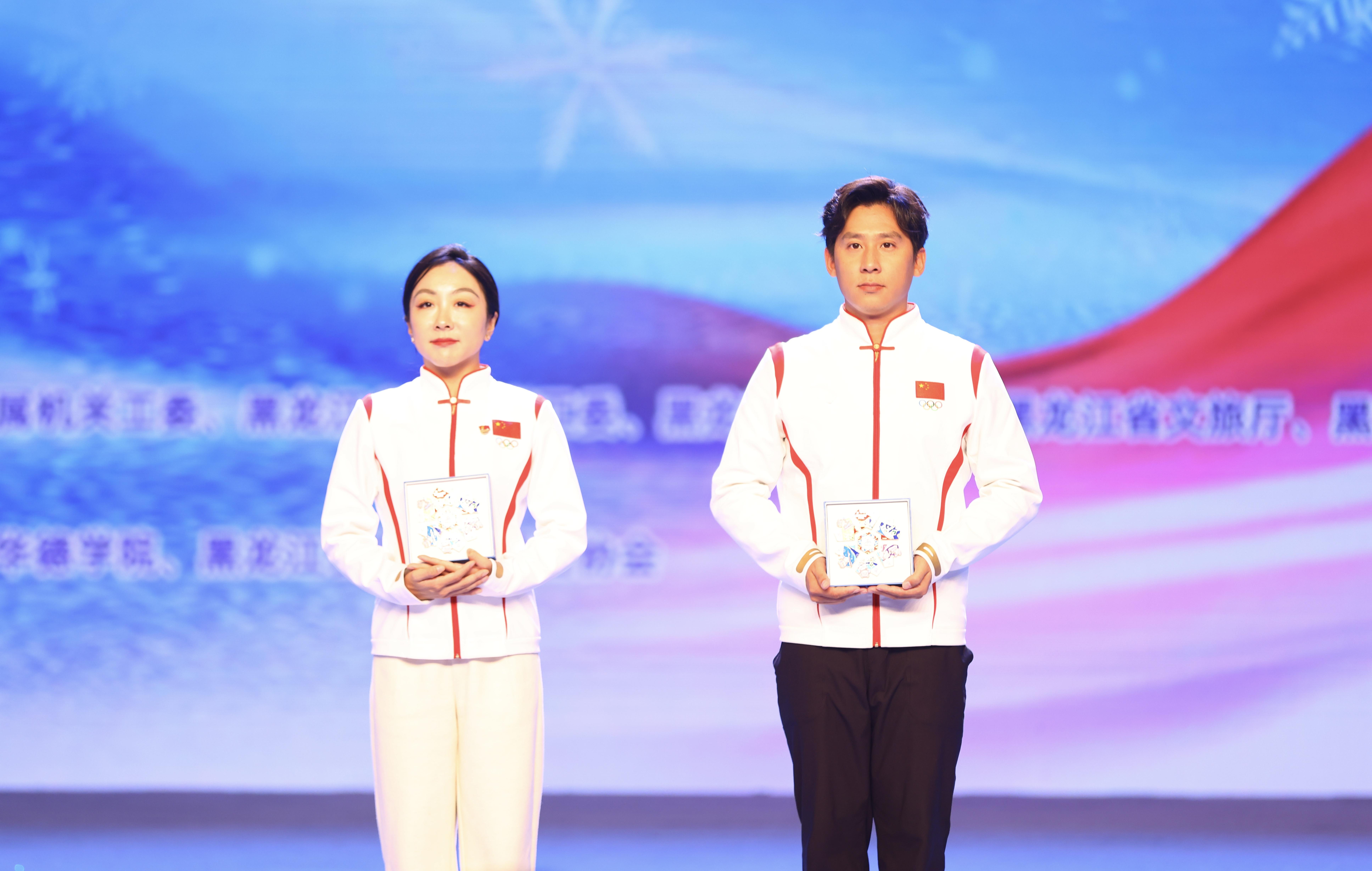 活动现场,宣布了2022年北京冬奥会花样滑冰双人滑世界冠军、哈尔滨籍国际运动健将韩聪、隋文静担任第九届亚冬会志愿服务公益形象大使并使颁发聘书、赠送志愿者徽章《心心相映》。